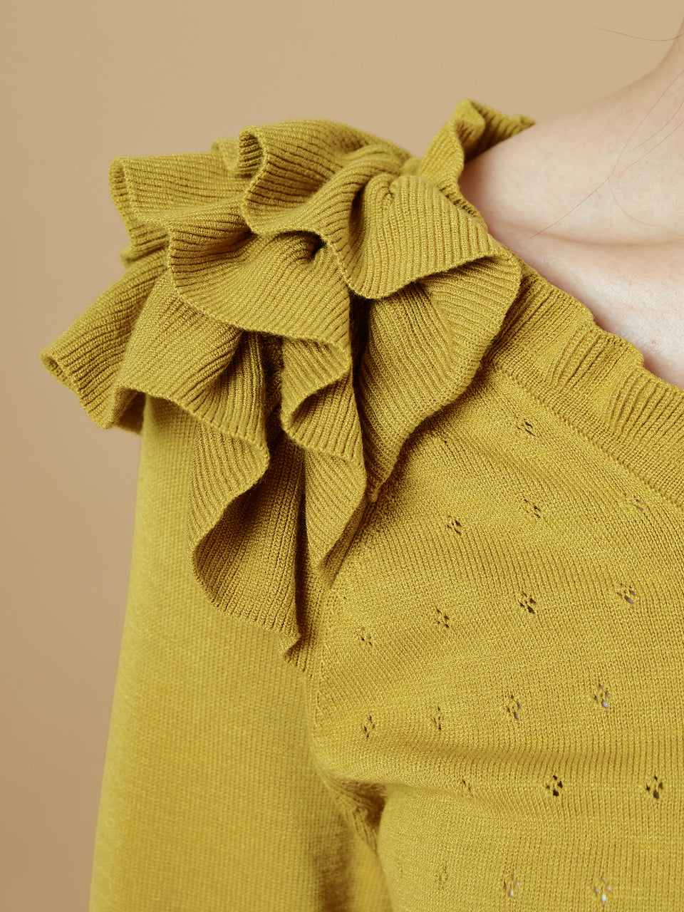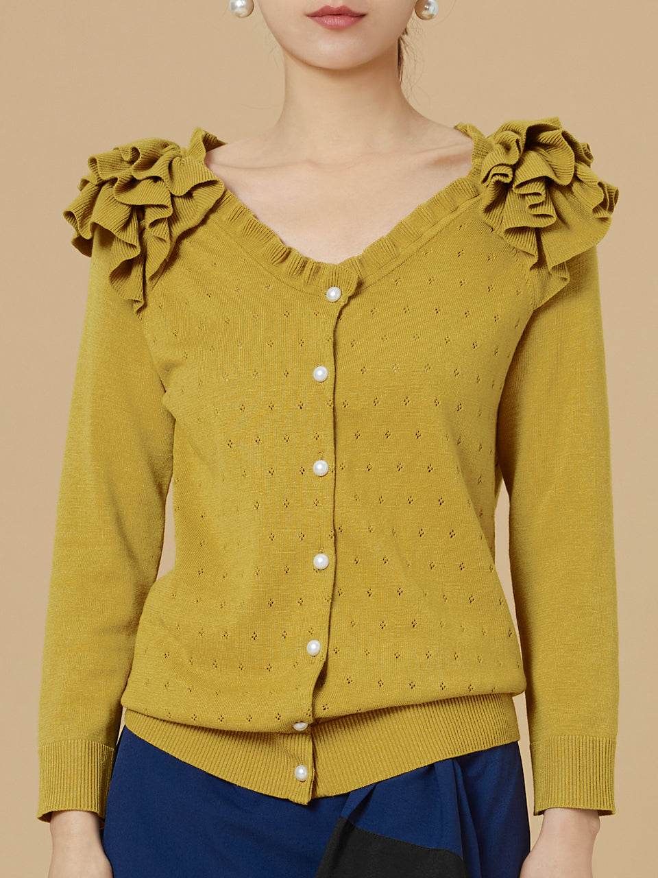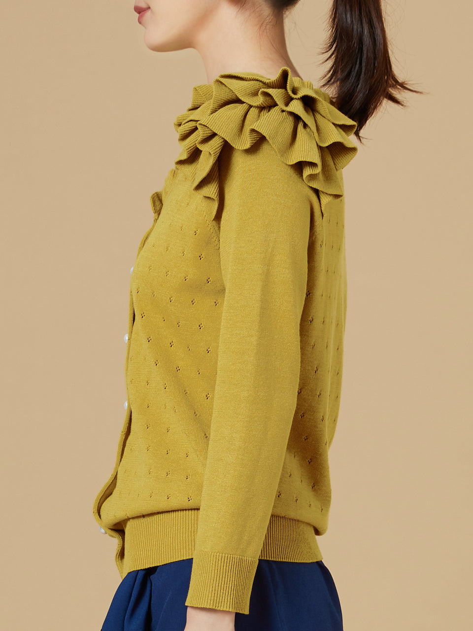驚喜促銷!黃色分層荷葉邊肩挑窿開襟衫