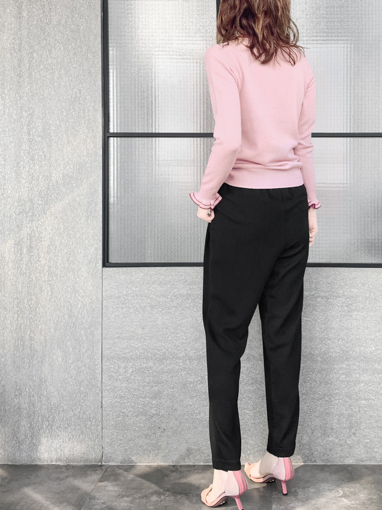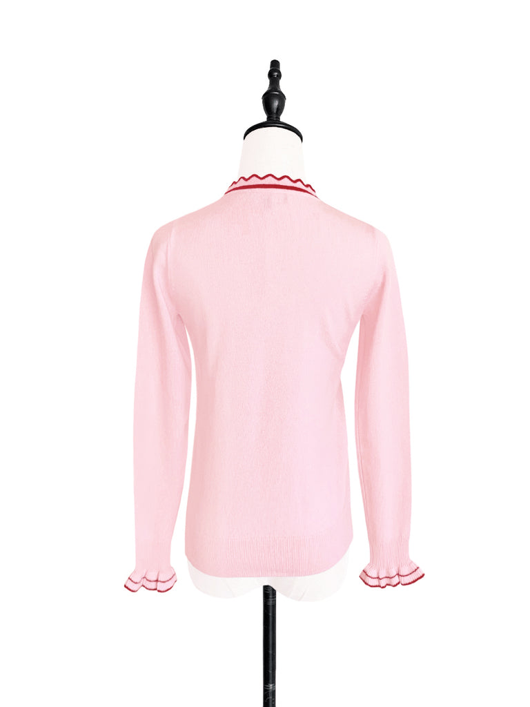驚喜促銷!撞色飾邊扇貝門襟荷葉邊袖口羊絨和羊毛開襟衫