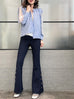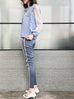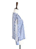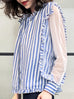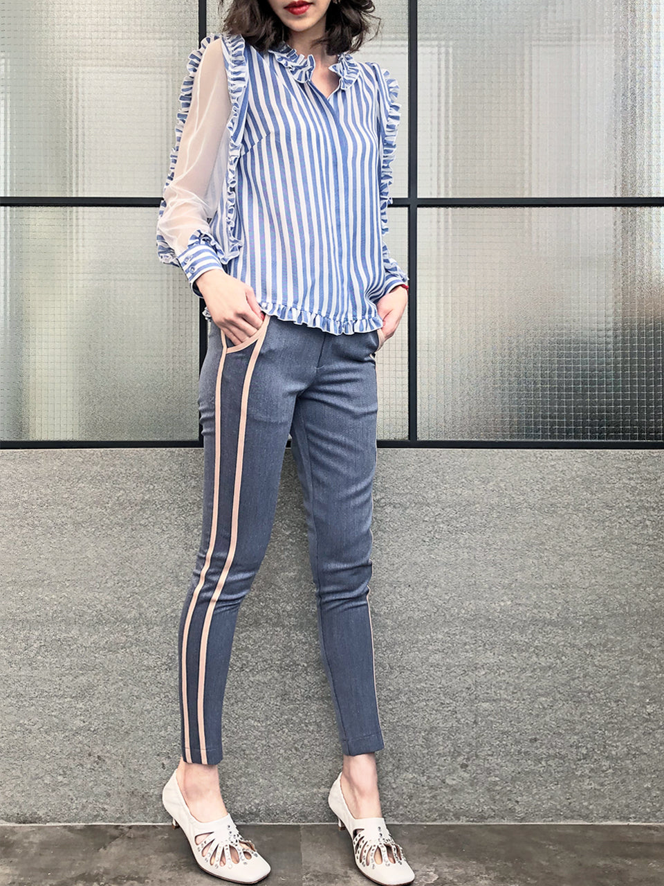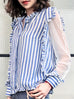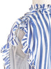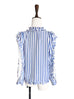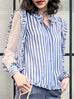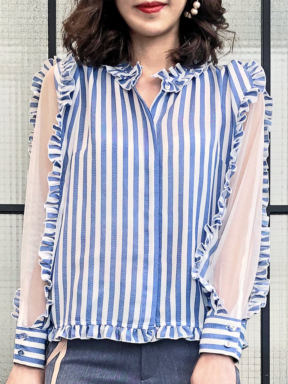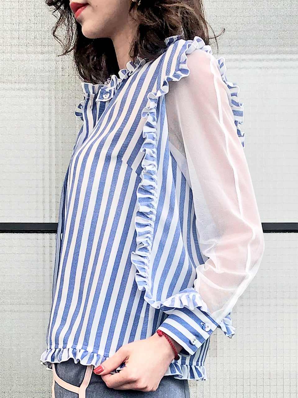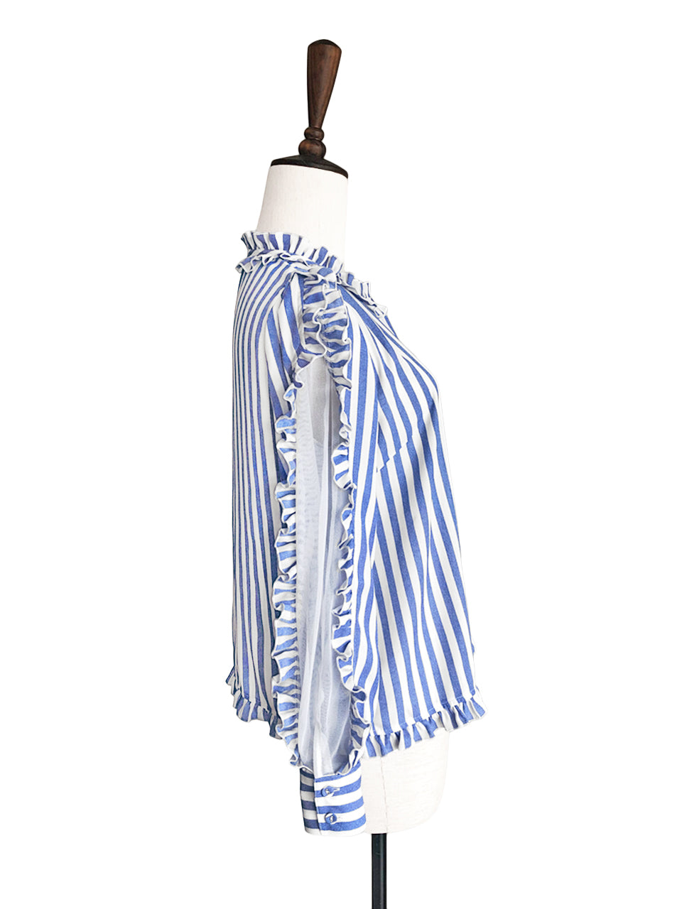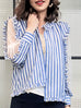 藍色條紋網眼分層袖荷葉邊棉混紡襯衫