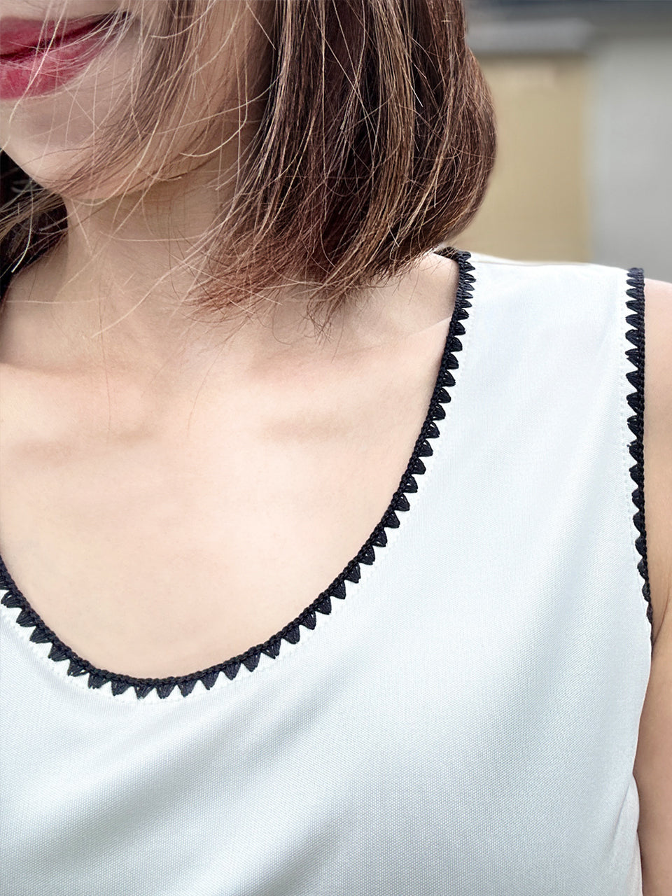 我們的流行設計升級了!因為即使是我們的內衣也值得被看到,我們設計的夏季背心具有一些引人注目的細節,包括扇形縫線細節的對比白色縫線和可拉伸平紋針織物。 She 擁有本季最受歡迎的單色,確實是必備單品。可與任何下裝疊穿或單穿。