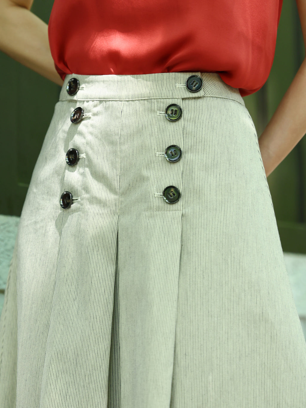 This knee-length skirt pairs tailored elegance with everyday ease. Designed with soft pleats and a gently flared silhouette, it features a double-breasted button front that adds a structured, modern touch. The fine pinstripes lend quiet sophistication, making it ideal for both work and casual wear. Available in light grey pinstripe and timeless black.