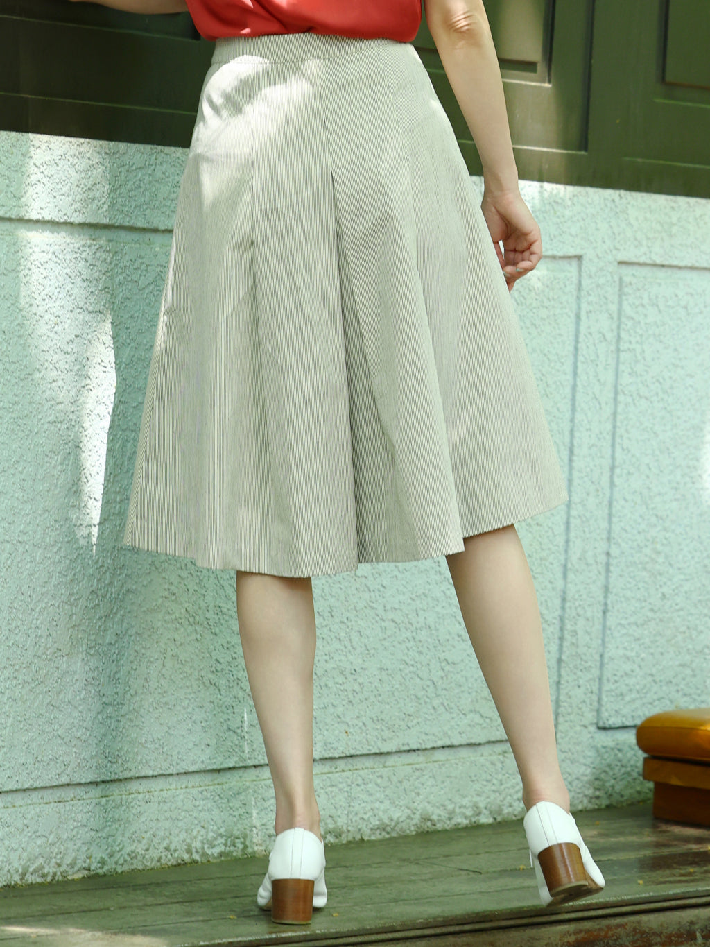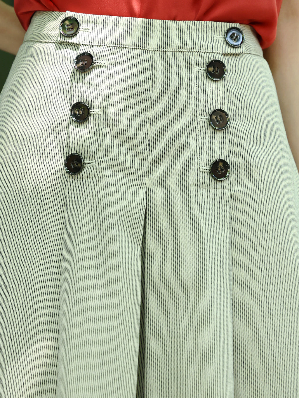 Striped Double-Breasted Pleated Knee-Length Skirt