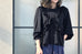 寬鬆的翻邊袖子增添了女性魅力;塞進煙管褲,搭配中性平底鞋