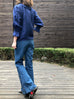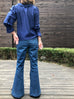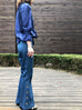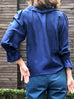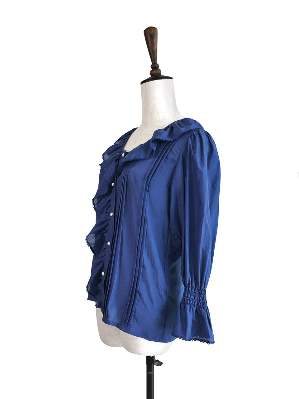 進一步出售!藍色真絲荷葉邊領褶皺拼接襯衫