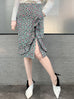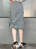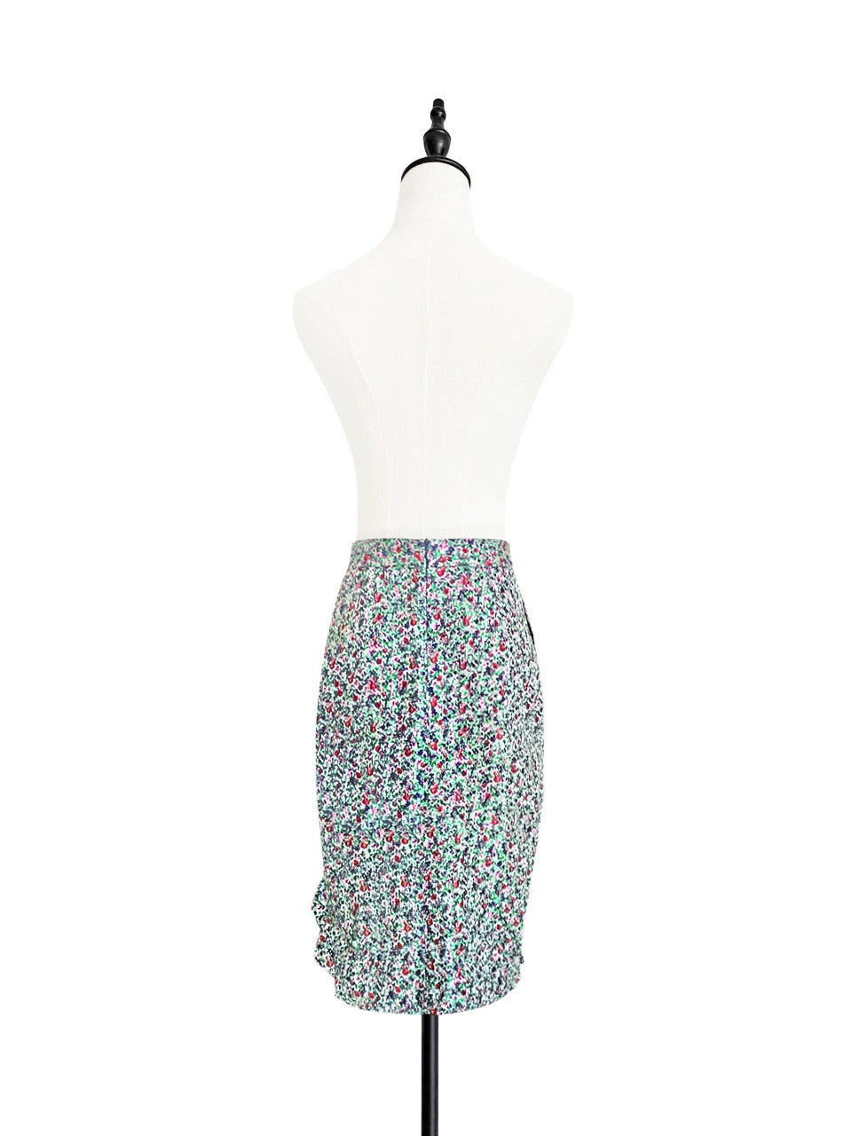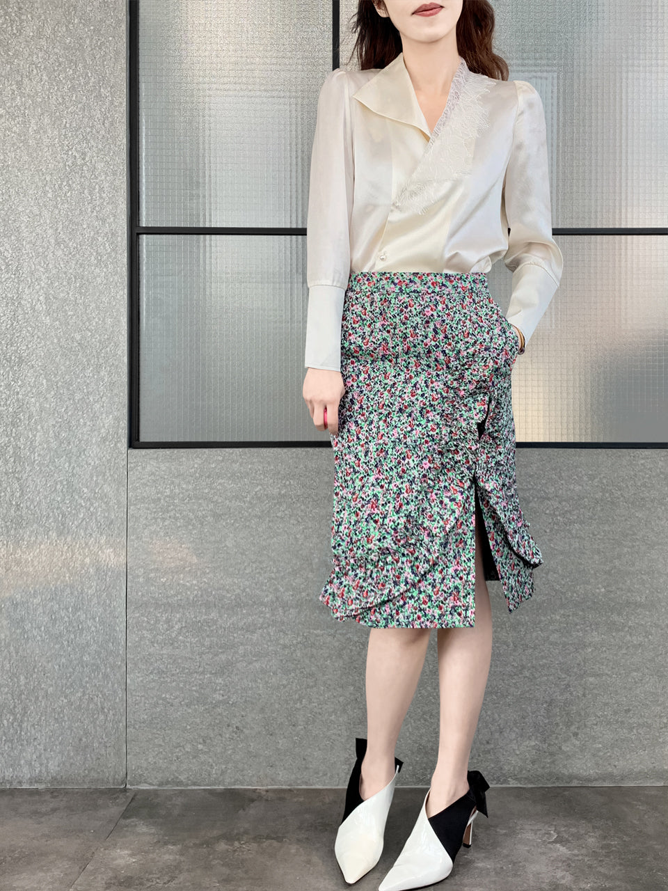 這款日裝半身裙採用明亮的花朵印花,露腿開衩處還飾有荷葉邊