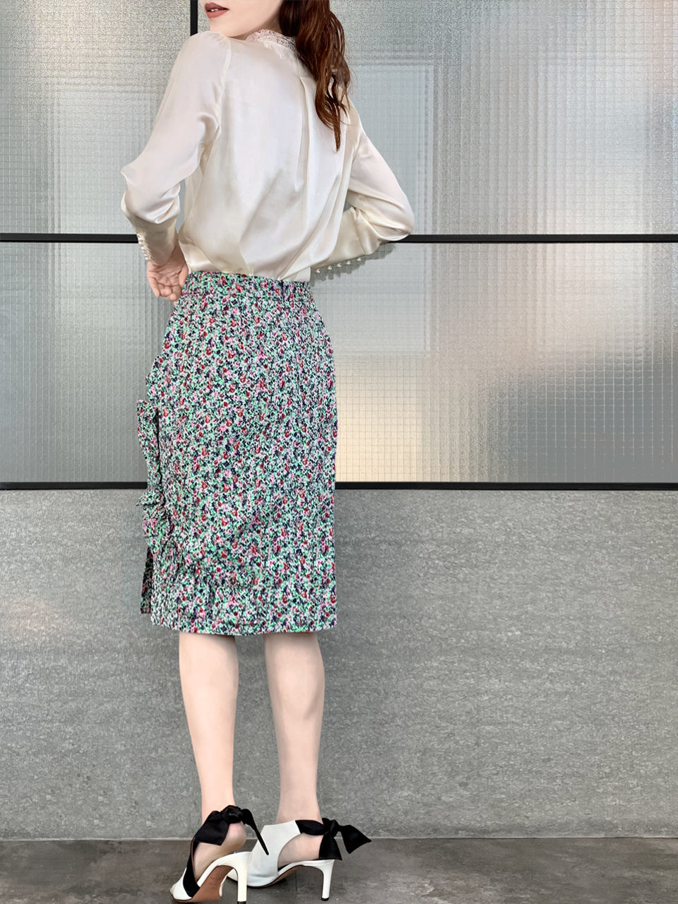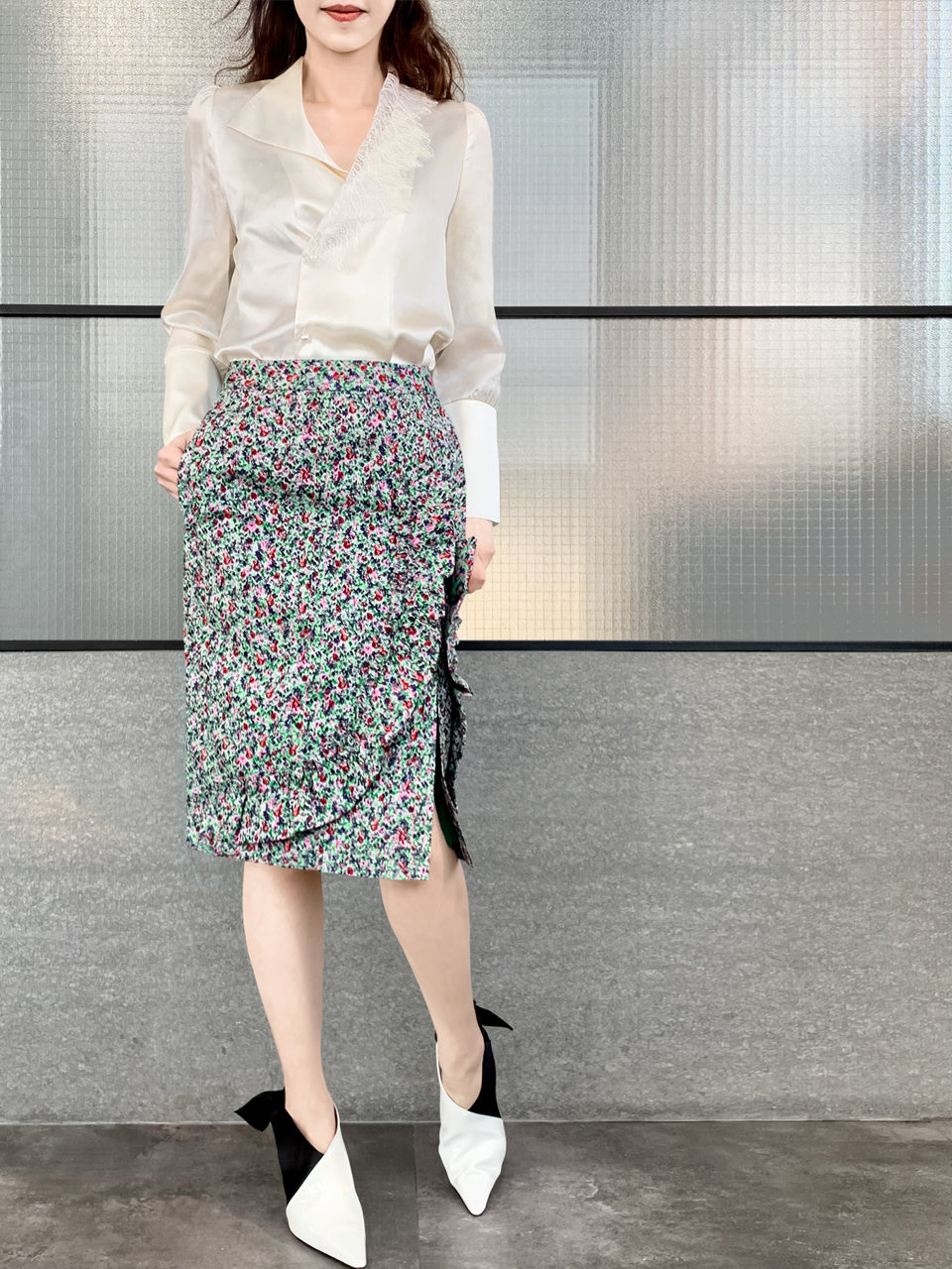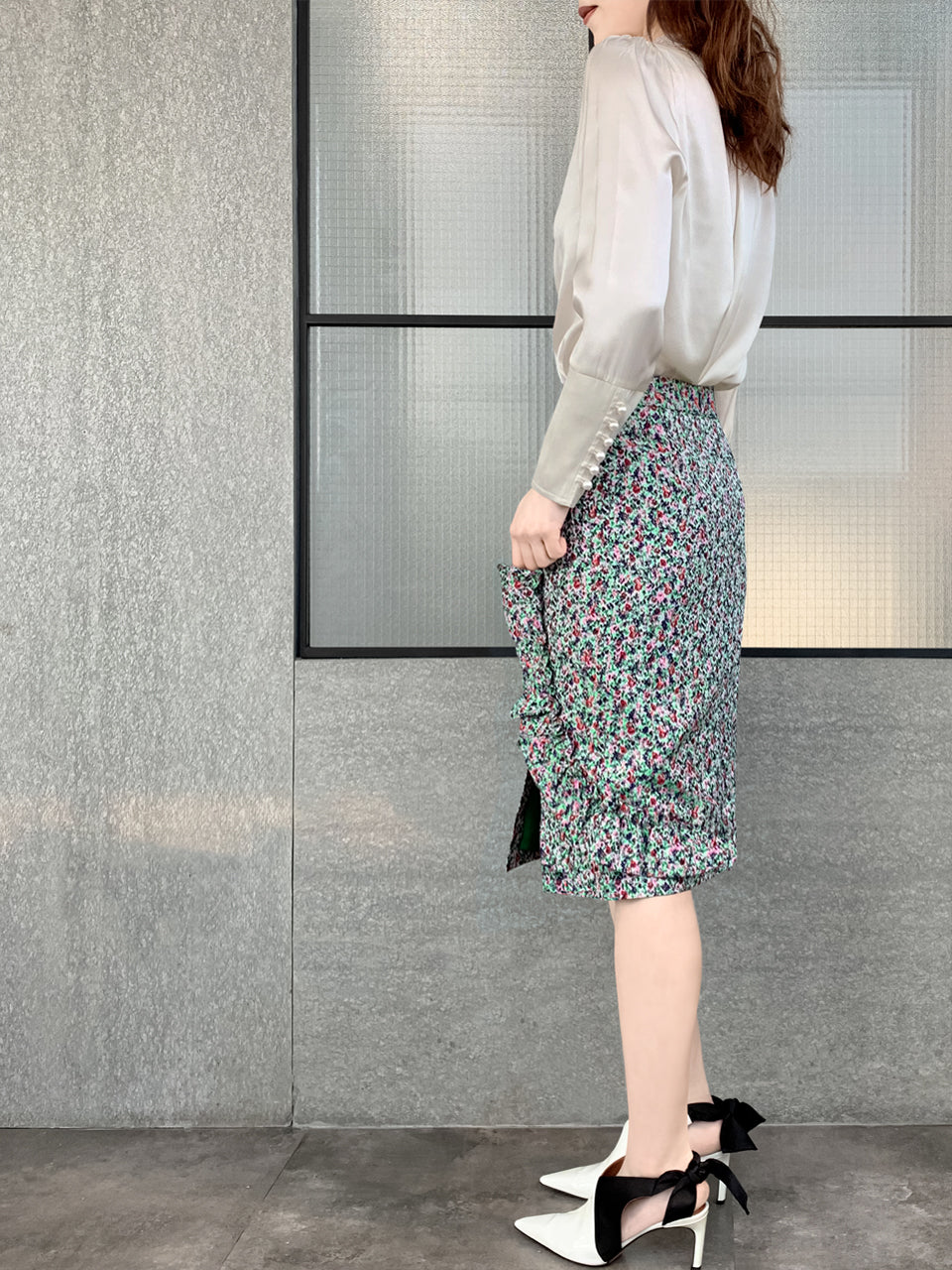 層疊荷葉邊和花朵印花提花凸顯經典鉛筆裙的浪漫氣息,褶皺荷葉邊裝飾凸顯曲線