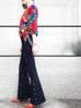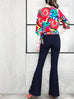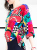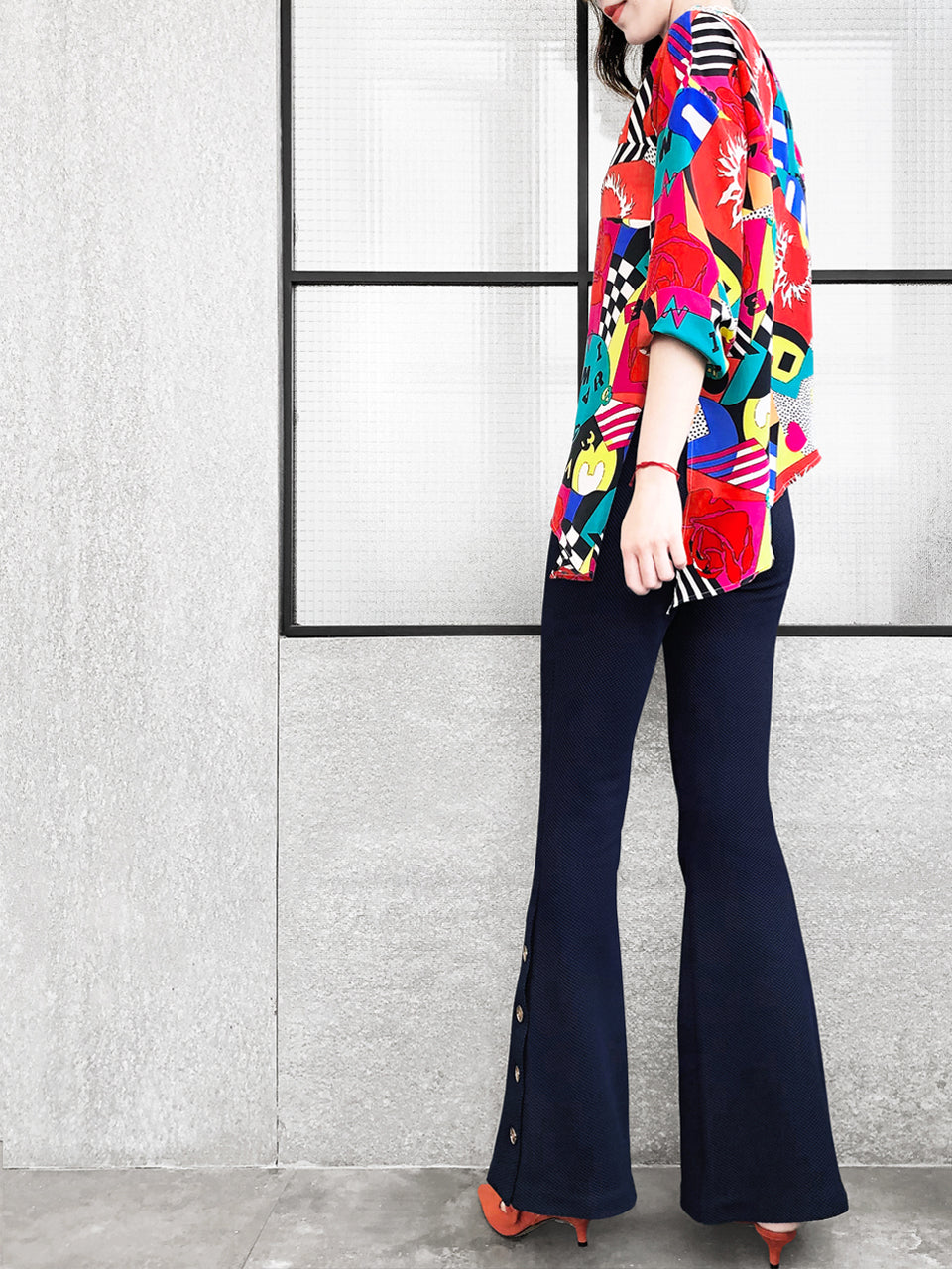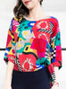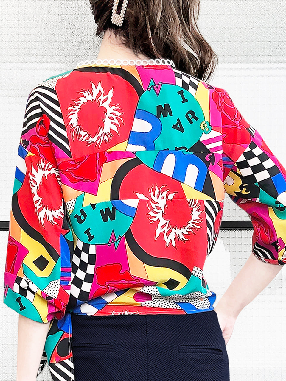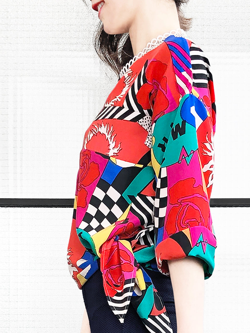 驚喜促銷!快樂印花圓形蕾絲領口繫帶腰部清爽絲質襯衫