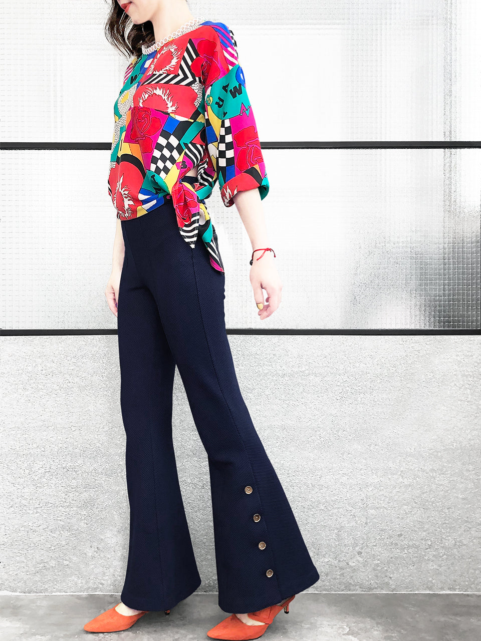 穿著寬鬆襯衫,腰部打結領帶優雅扣住垂褶細節,打造70 年代風格