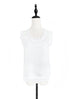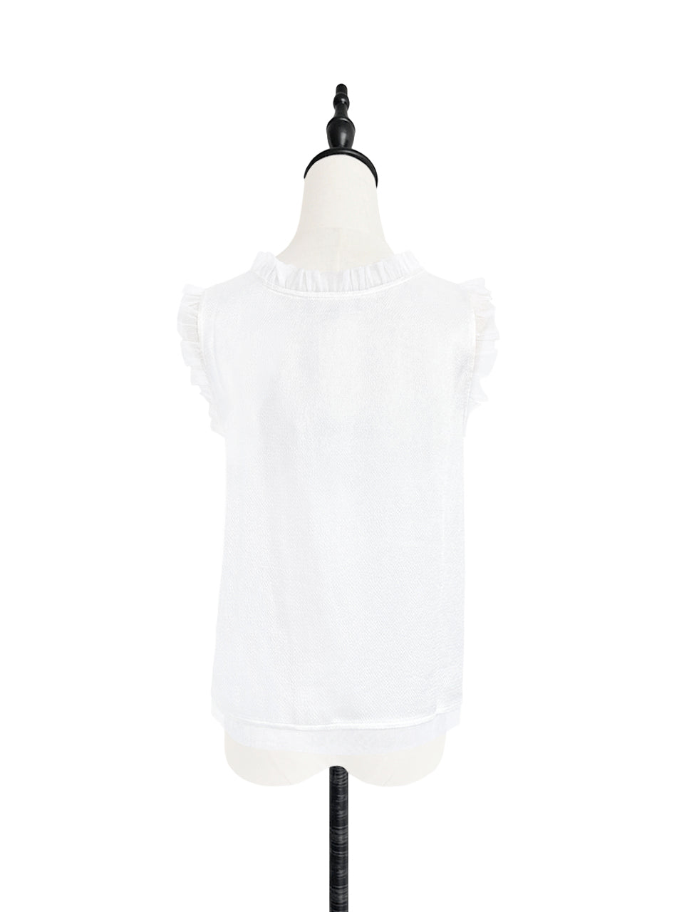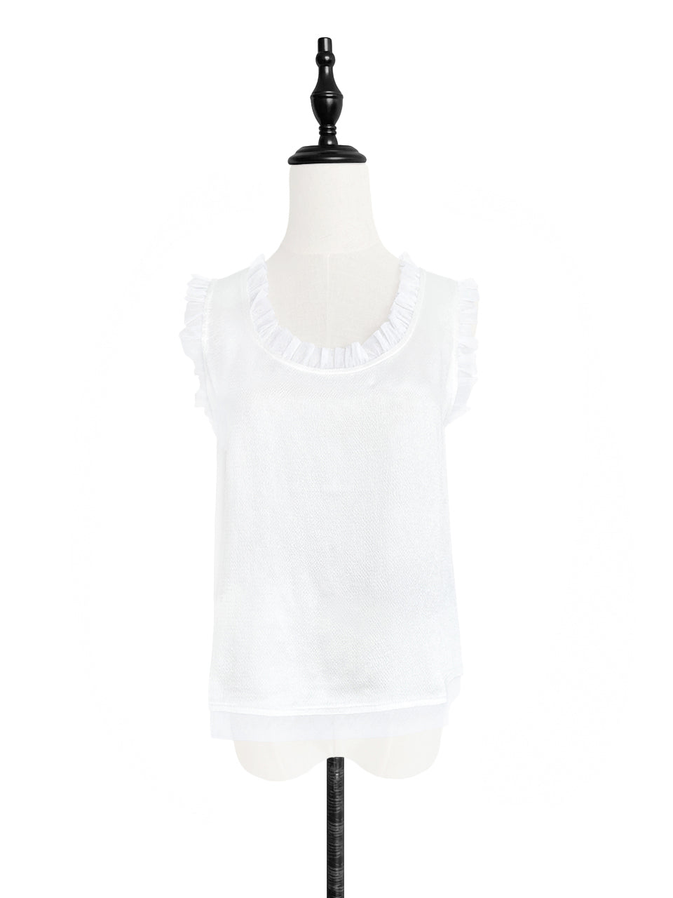 這款優雅的背心採用冷白色的優雅紋理光澤緞面,適合作為工作日或週末造型的一層,或者在溫暖的日子裡單獨穿著,飾有褶邊相配的冷白色薄紗袖孔和領口,使其成為最可愛的選擇你衣櫃裡的一件