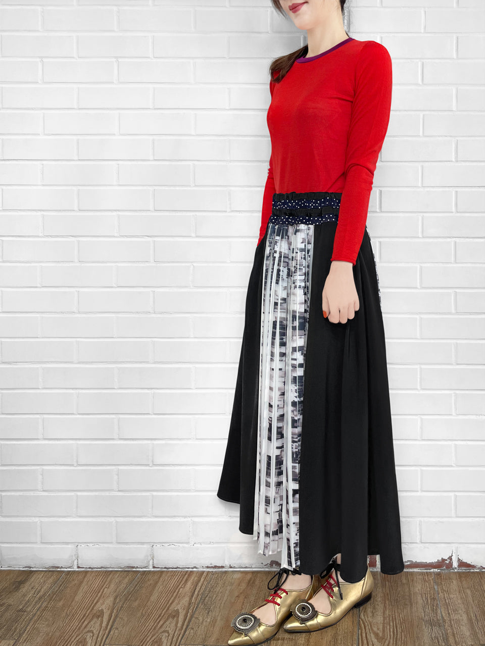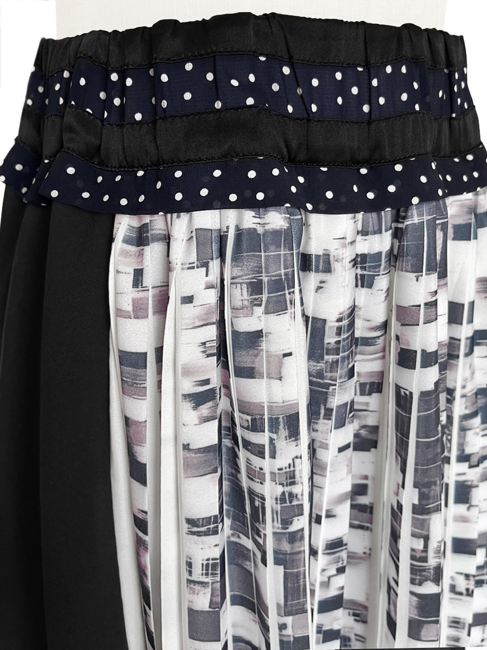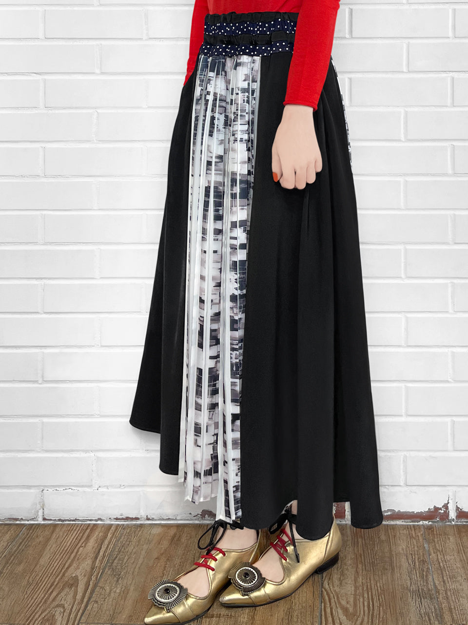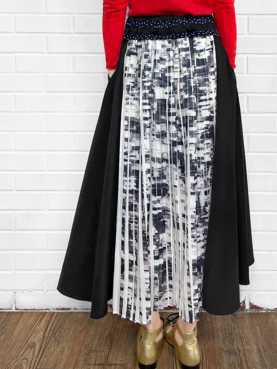 驚喜促銷!混合材質正面和背面褶皺中長半身裙
