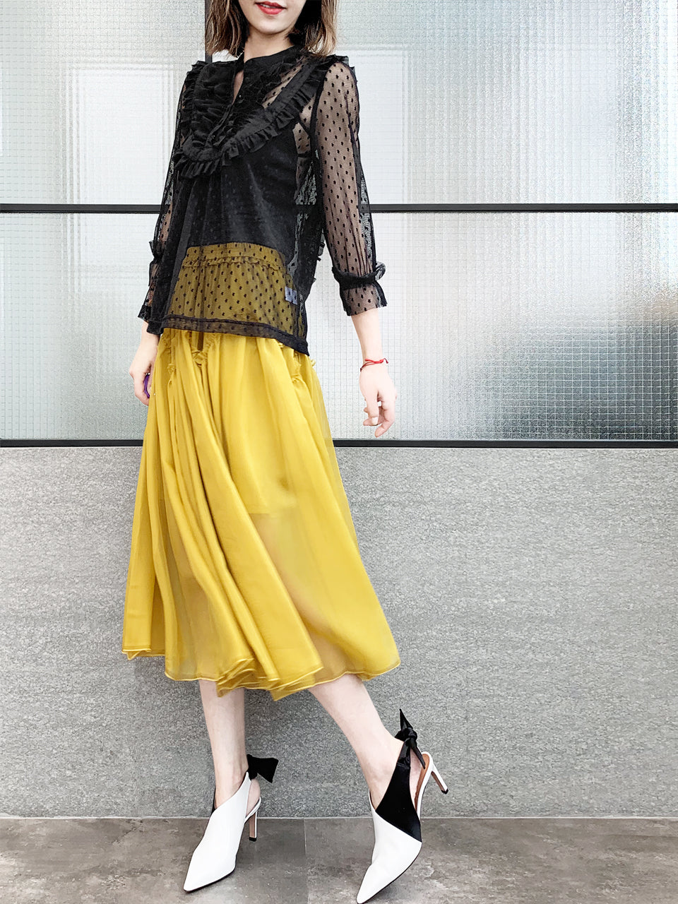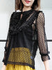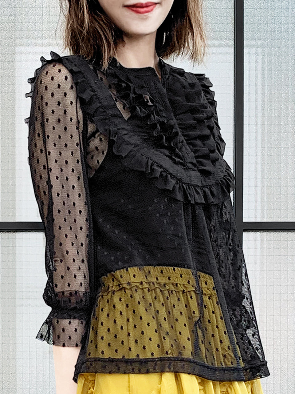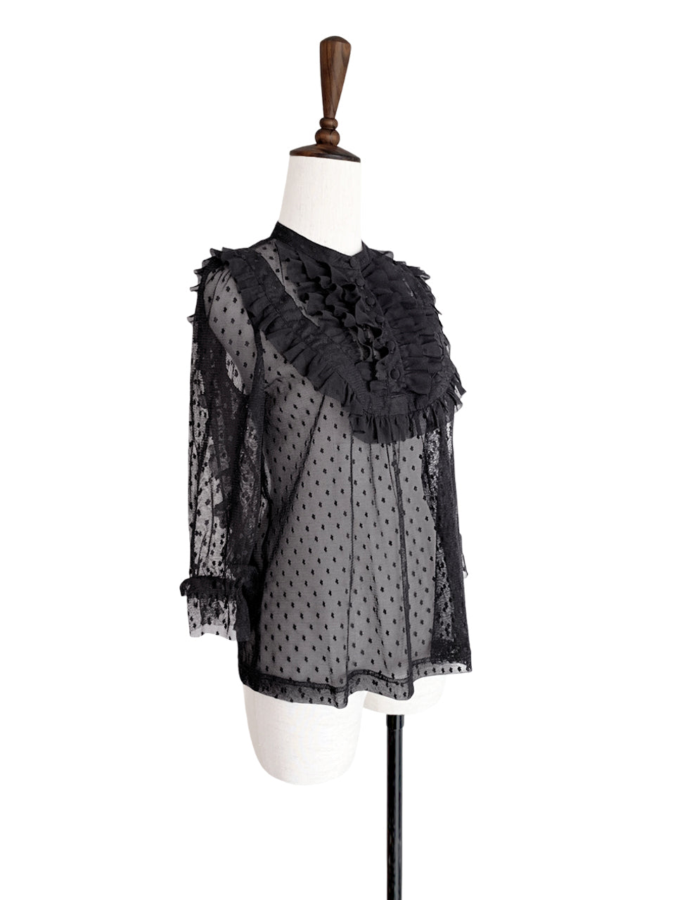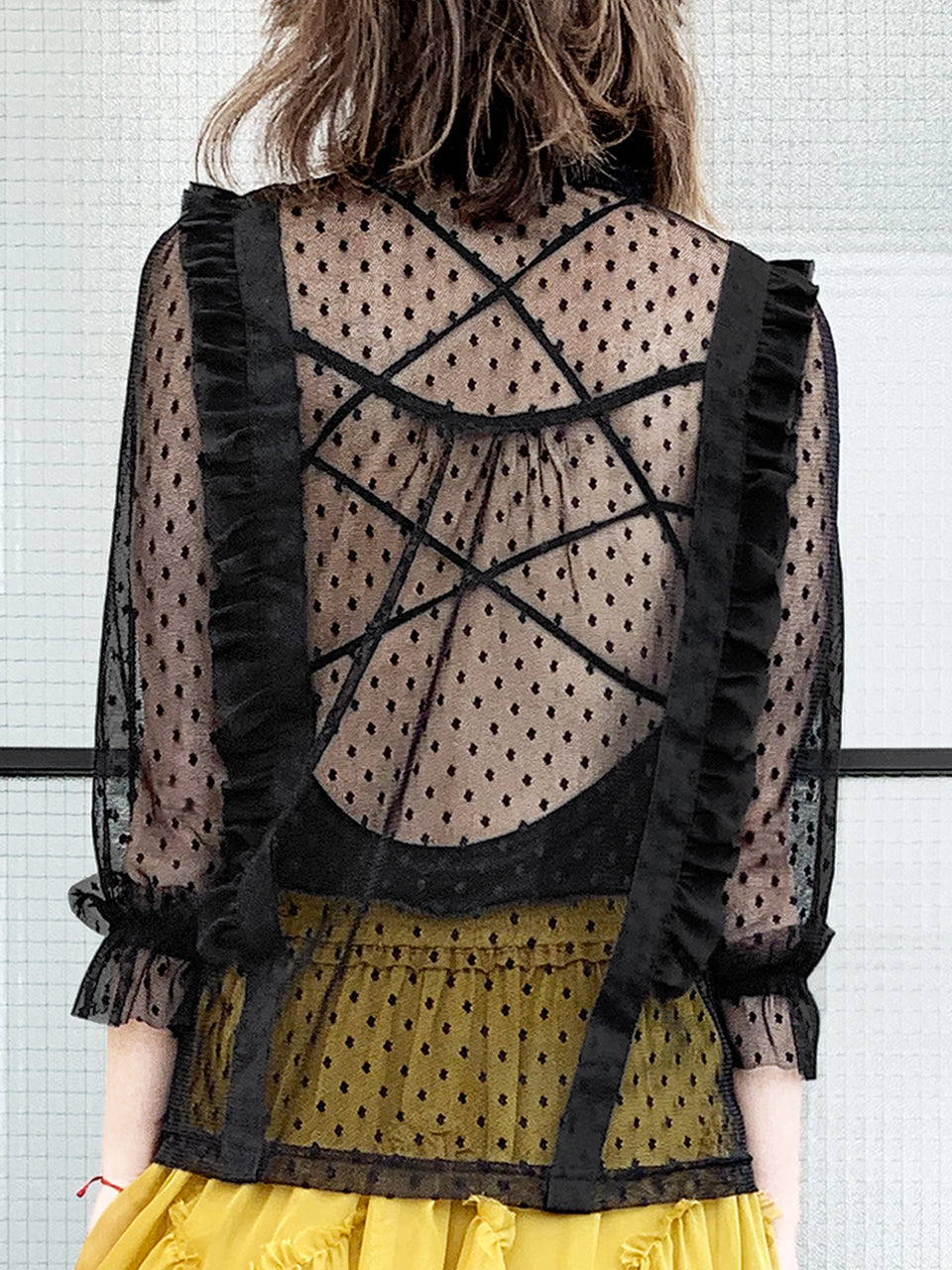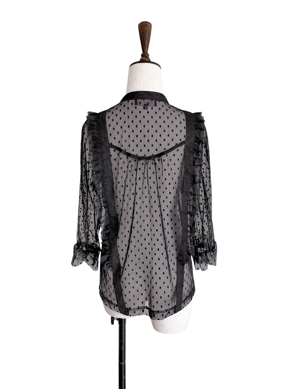最後的機會!黑色波點荷葉領透明薄紗襯衫
