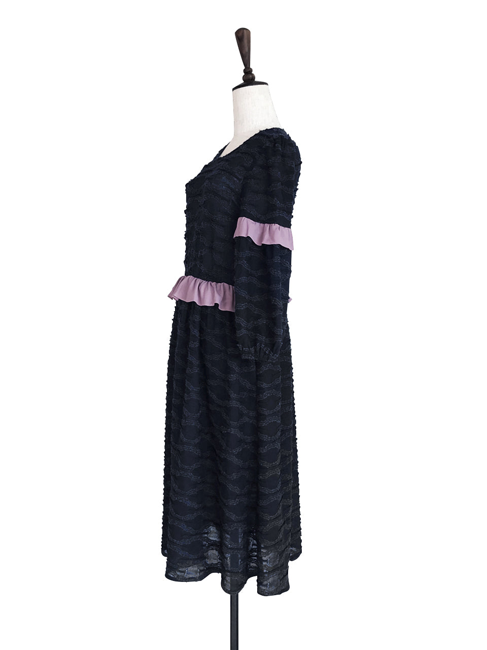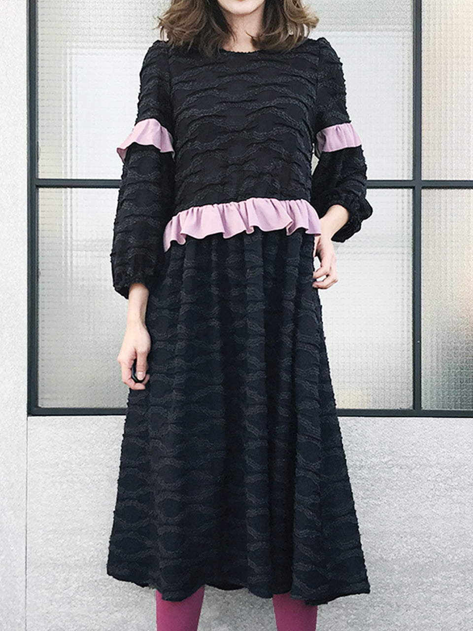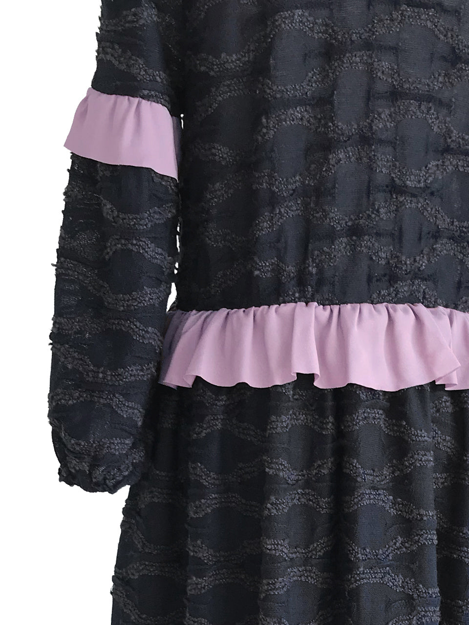 這款復古別緻的連身裙採用紋理針織罩層進行升級,配有超級寬鬆的袖子和一些浪漫薰衣草色的褶邊荷葉邊。這款直筒洋裝飾有荷葉邊蕾絲袖和鬆緊荷葉邊腰線,巧妙地體現了辦公室的復古時尚氣息。這個季節充滿了浪漫,所以用豐富的荷葉邊來表達你的愛。