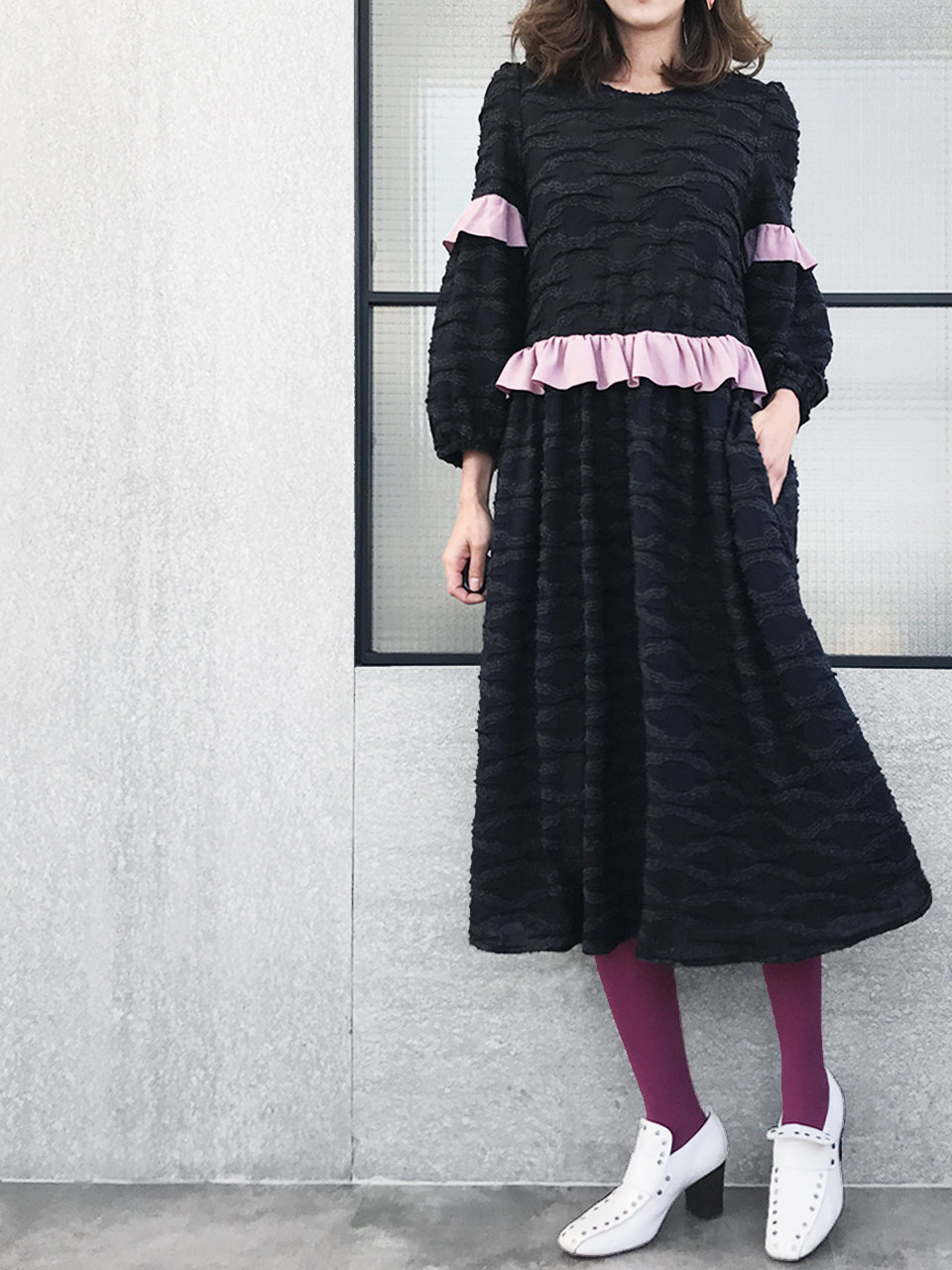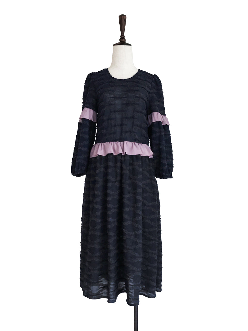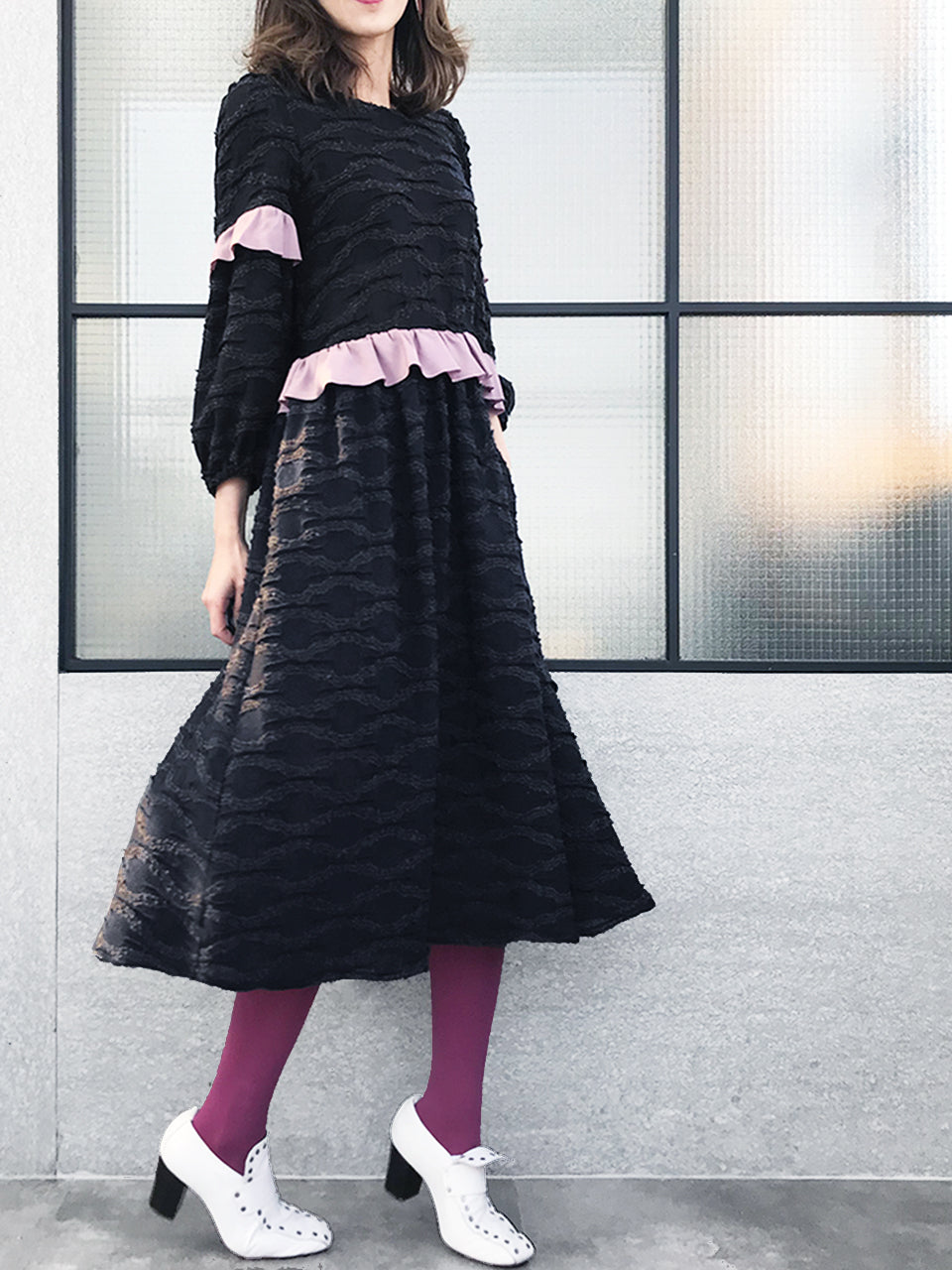 這款復古別緻的連身裙採用紋理針織罩層進行升級,配有超級寬鬆的袖子和一些浪漫薰衣草色的褶邊荷葉邊。這款直筒洋裝飾有荷葉邊蕾絲袖和鬆緊荷葉邊腰線,巧妙地體現了辦公室的復古時尚氣息。這個季節充滿了浪漫,所以用豐富的荷葉邊來表達你的愛。