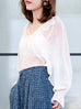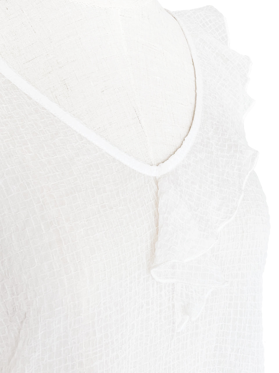 荷葉邊 V 領和隨處穿著的開衩高/低下擺為這款透明絲質襯衫帶來輕鬆優雅的感覺