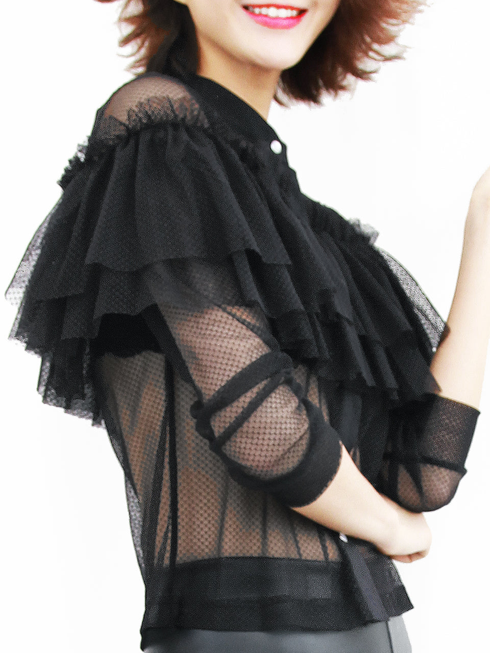 活潑的荷葉邊鑲片橫掃超薄網狀網眼上衣的正面,採用雙層泡棉荷葉邊設計