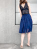 巧妙的喇叭形下擺增強了寶藍色及膝裙的飄逸輪廓,散發著浪漫氣息,適合辦公室和約會之夜