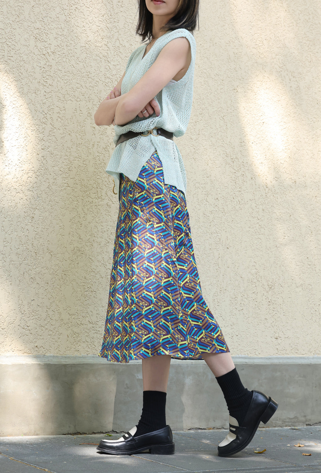This sophisticated midi skirt features a unique layered waistline that adds depth and style to its A-line silhouette. The flowing design and subtle diagonal seams enhance movement, making this skirt both comfortable and effortlessly chic. Perfect for dressing up or down, it’s a versatile addition to any wardrobe.