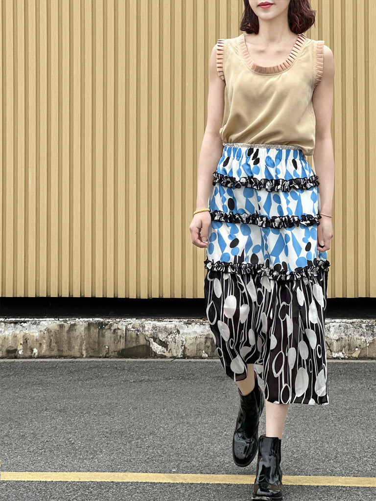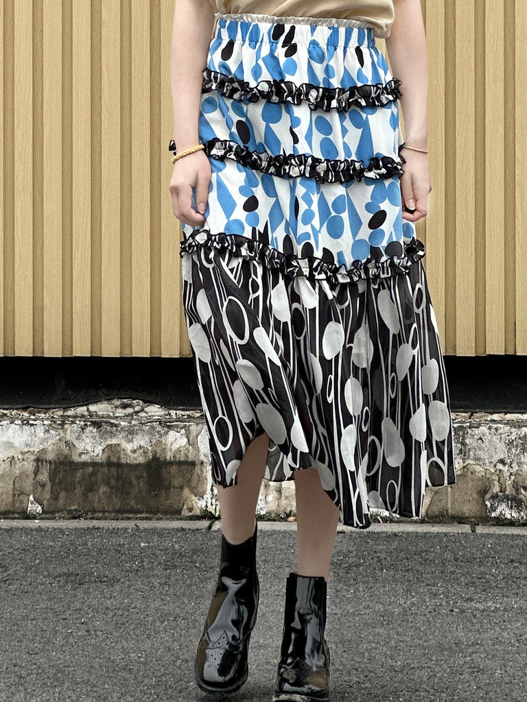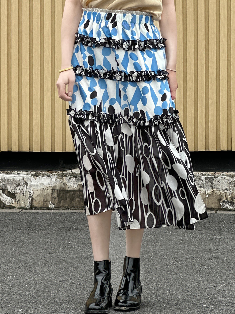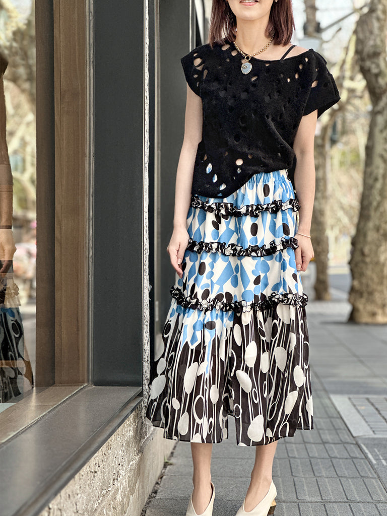 混合圓點荷葉邊分層雪紡透氣超長半身裙