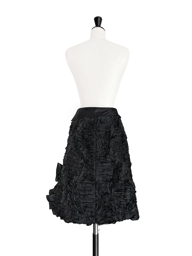 黑色正面開衩鉛筆裙,背面飾有褶襉蕾絲
