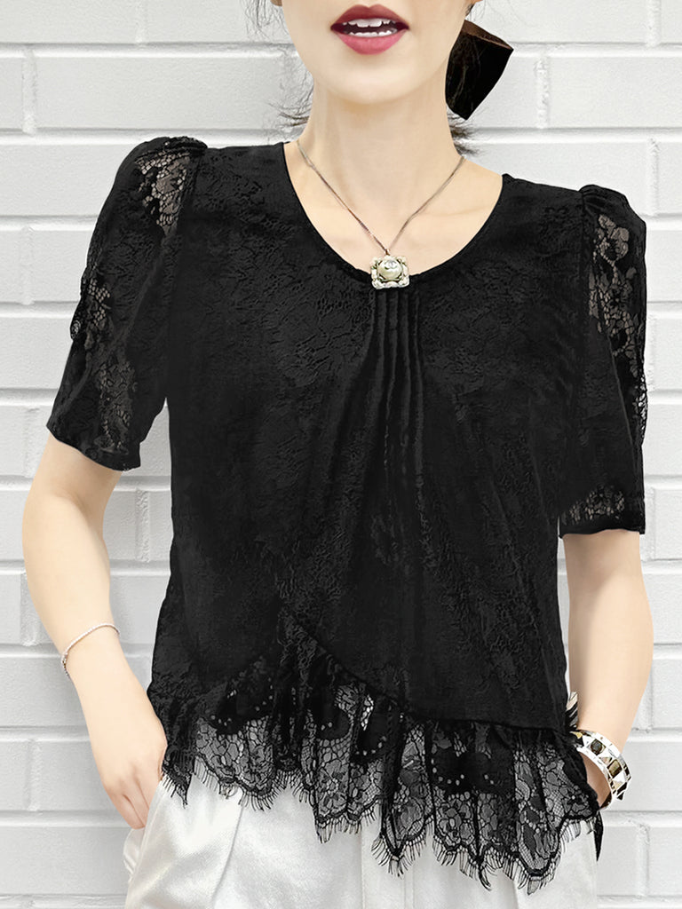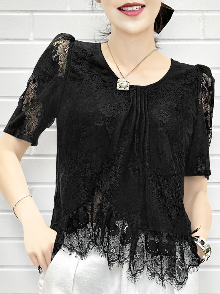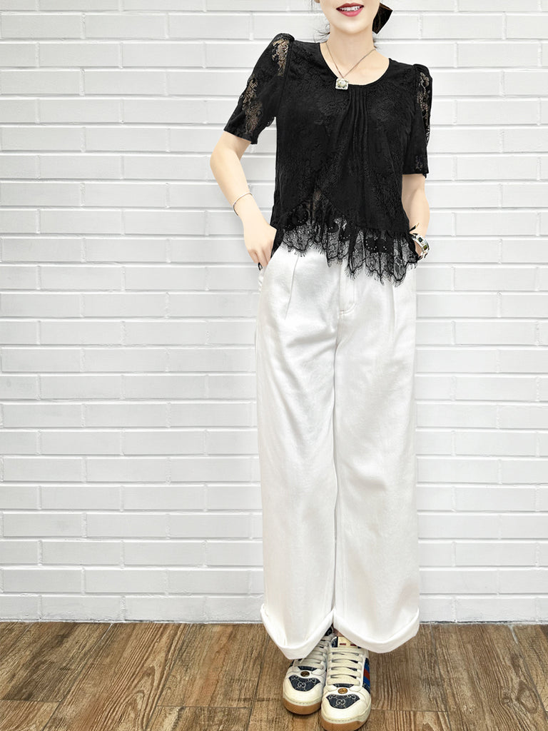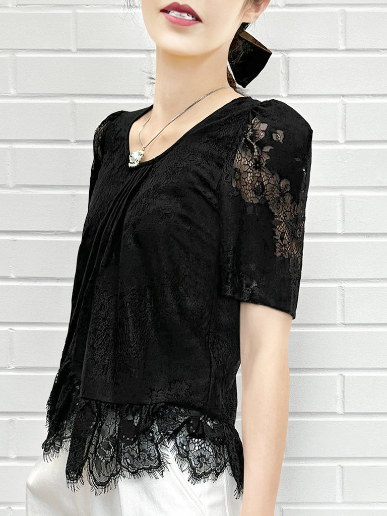 Final Sale! Black Pin Dot Eyelash Lace Collar Long Cuff Shirt