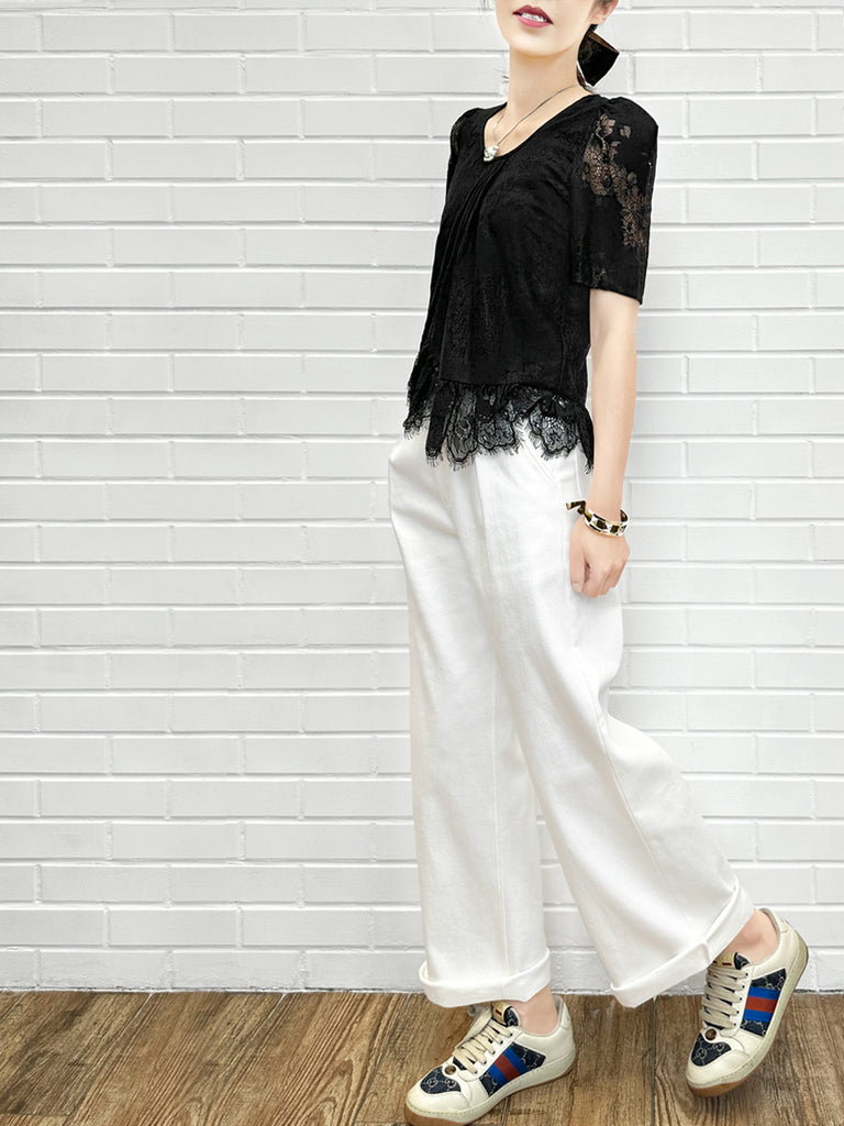 Final Sale! White Pin Dot Eyelash Lace Collar Long Cuff Shirt