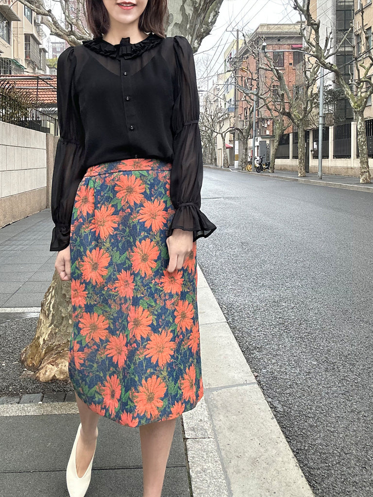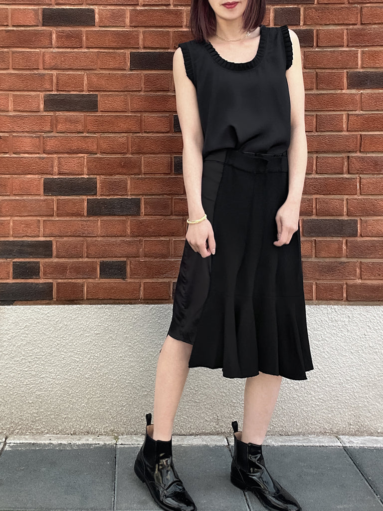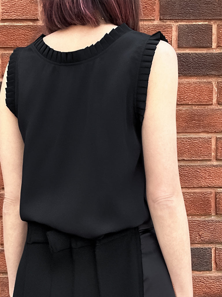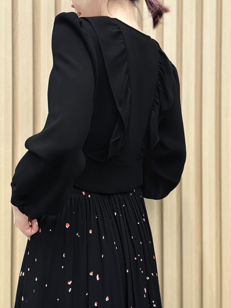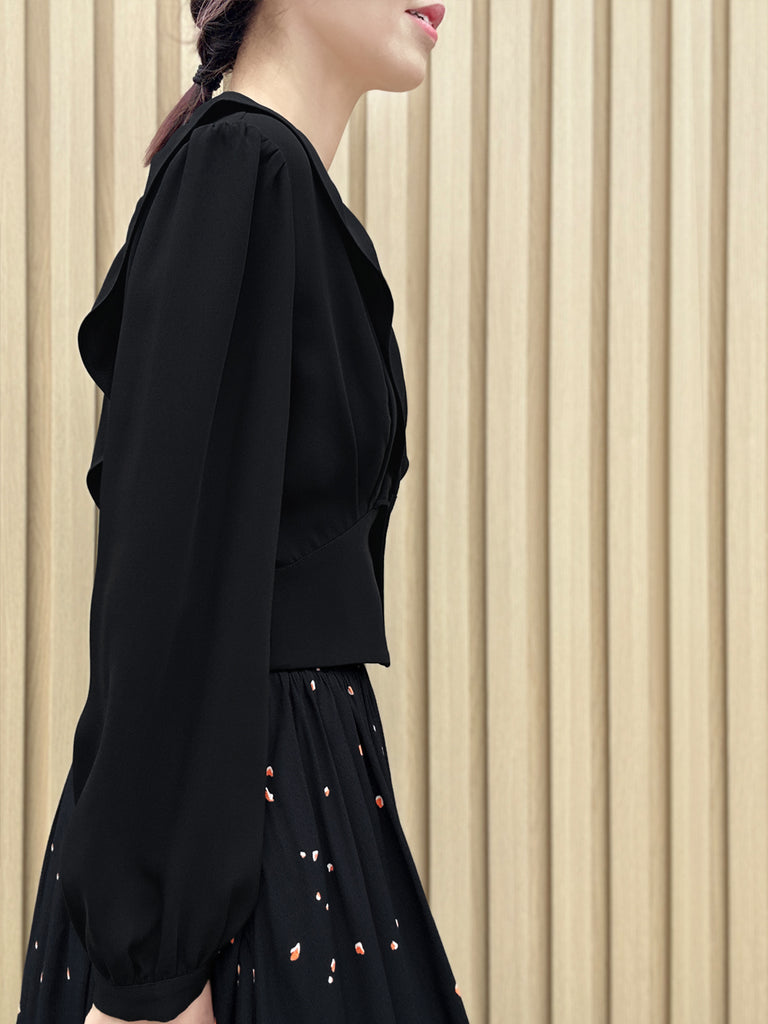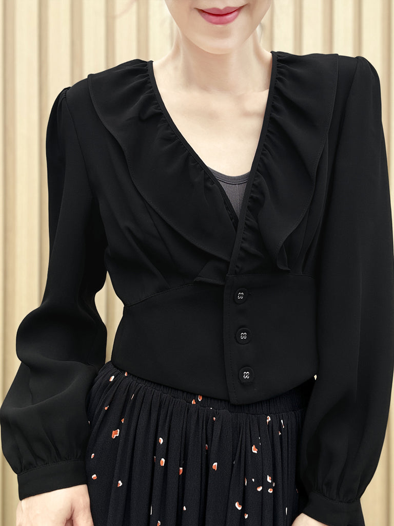純黑色褶皺領層袖絲質襯衫