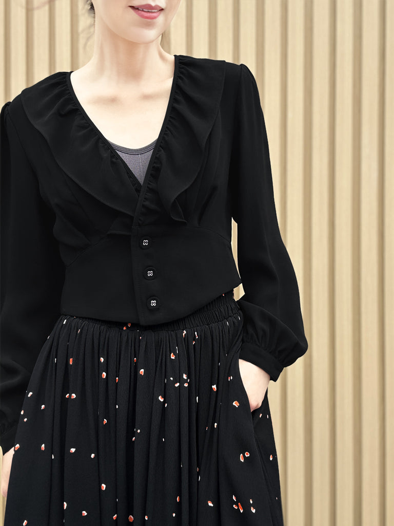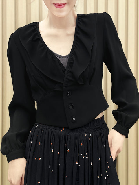 Last Chance! Black Lustrous Double Breasted Ruffles V-neck Crop Top