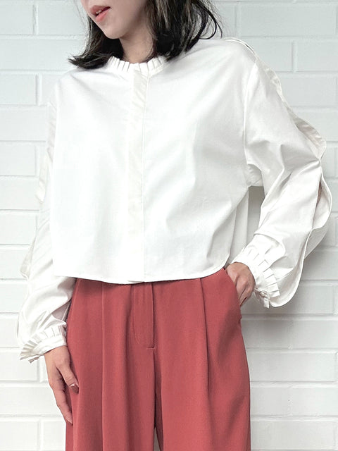 白色開衩細節燈籠袖荷葉邊長襯衫
