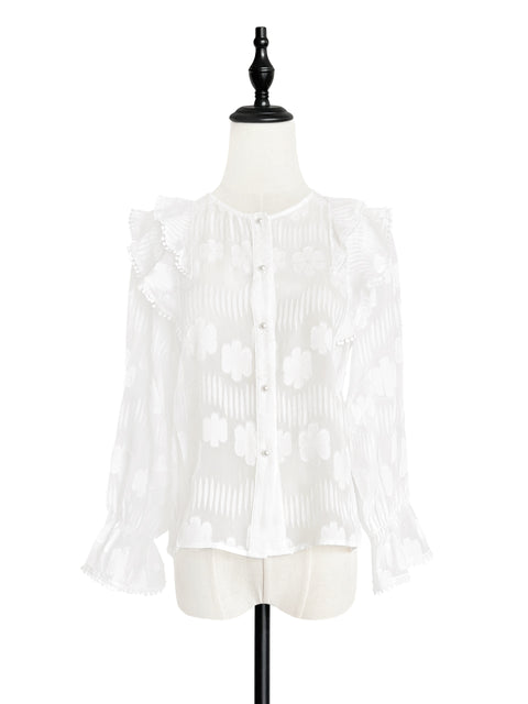 同色褶皺花朵荷葉邊泡泡袖絲質襯衫