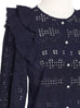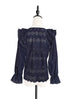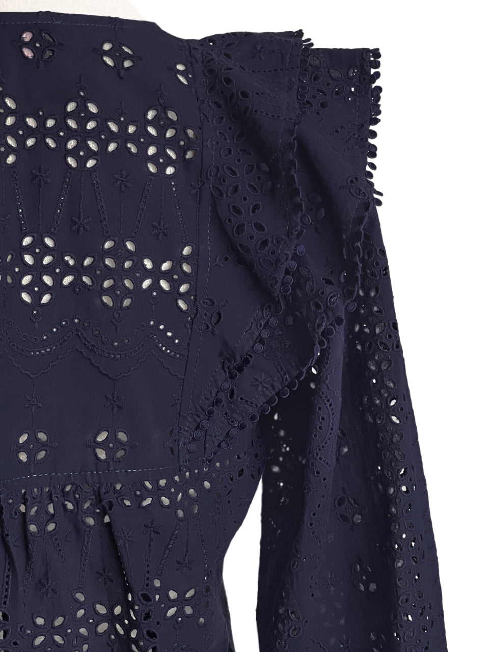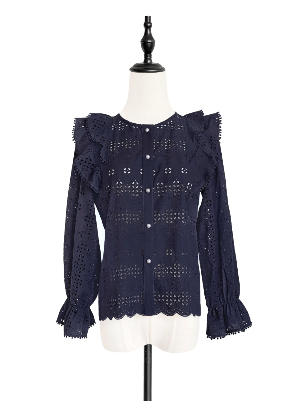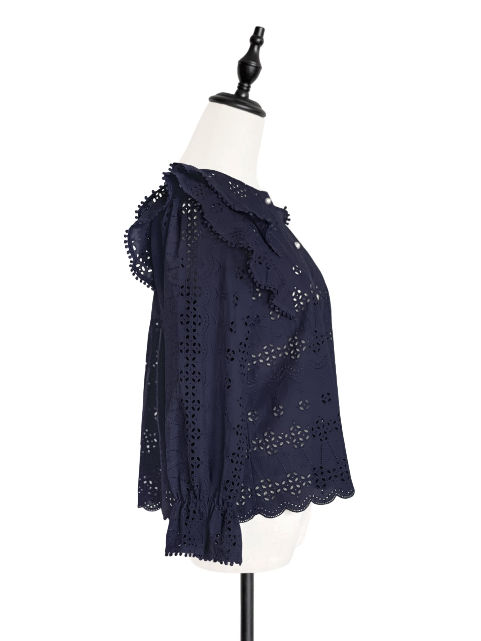 深海軍藍蕾絲荷葉邊泡泡袖孔眼棉質襯衫
