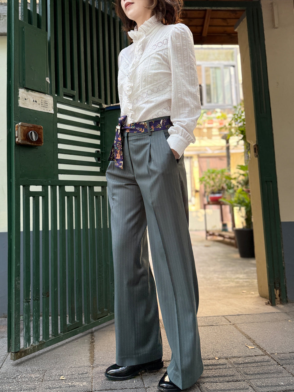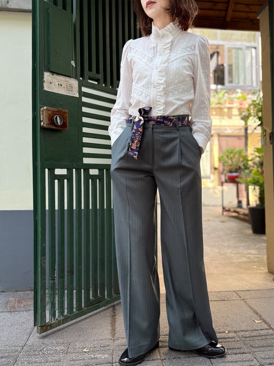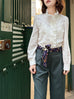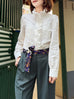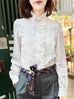 Proudly present this patch lace version! So delicate and just perfectly elegant. Introducing our charming ruffle placket shirt, a delightful addition to your closet. This long-sleeve shirt features a playful high collar with ruffles and covered buttons, adding a touch of whimsy to any outfit. With its straight hem and slightly puffed shoulders, it's both stylish and comfortable for any occasion.