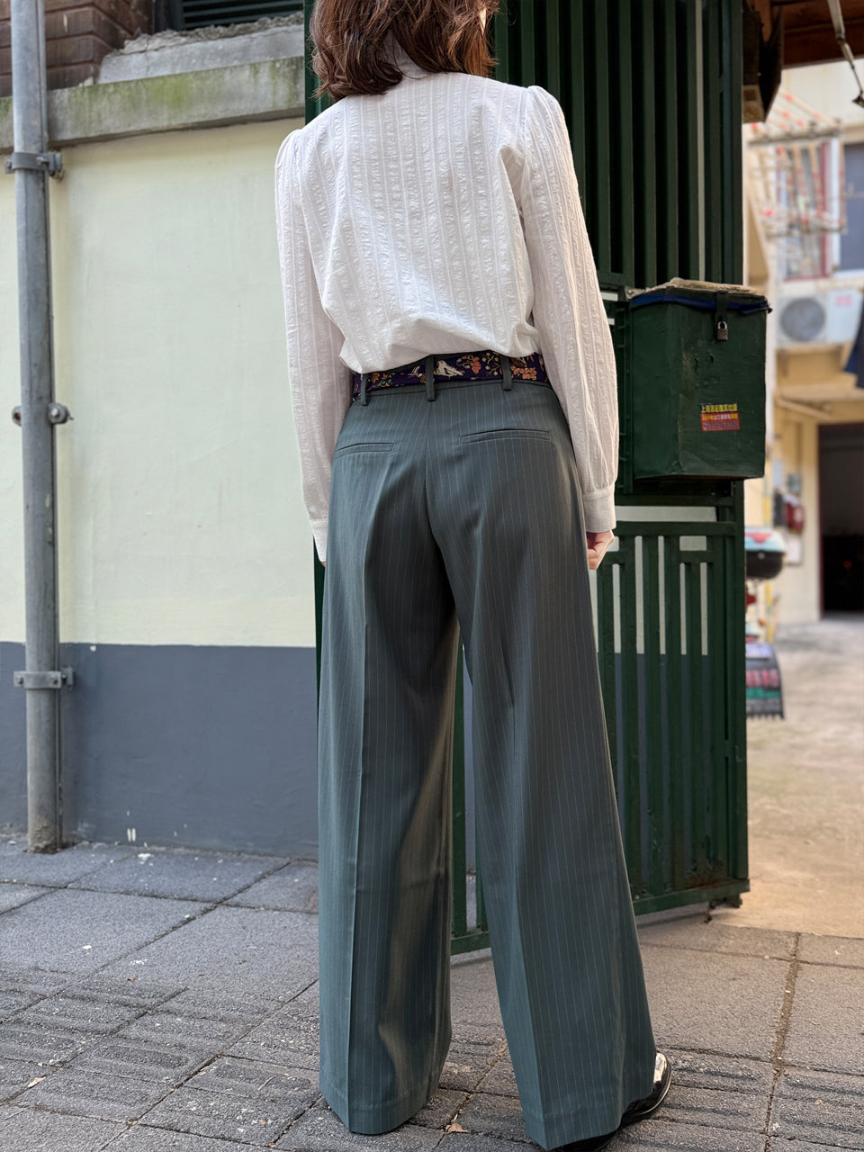 Tonal fabric button closure; long sleeves with buttoned cuffs