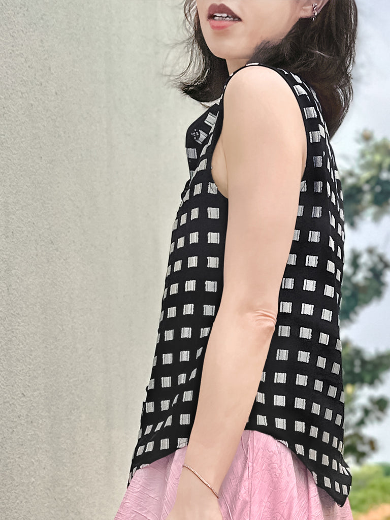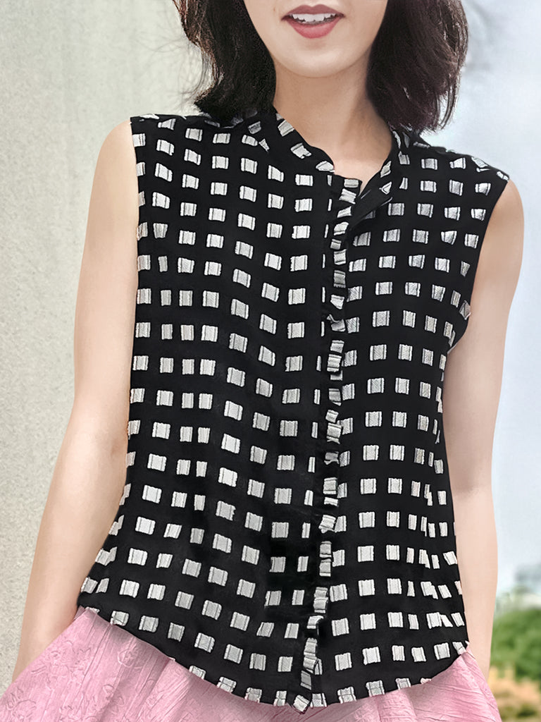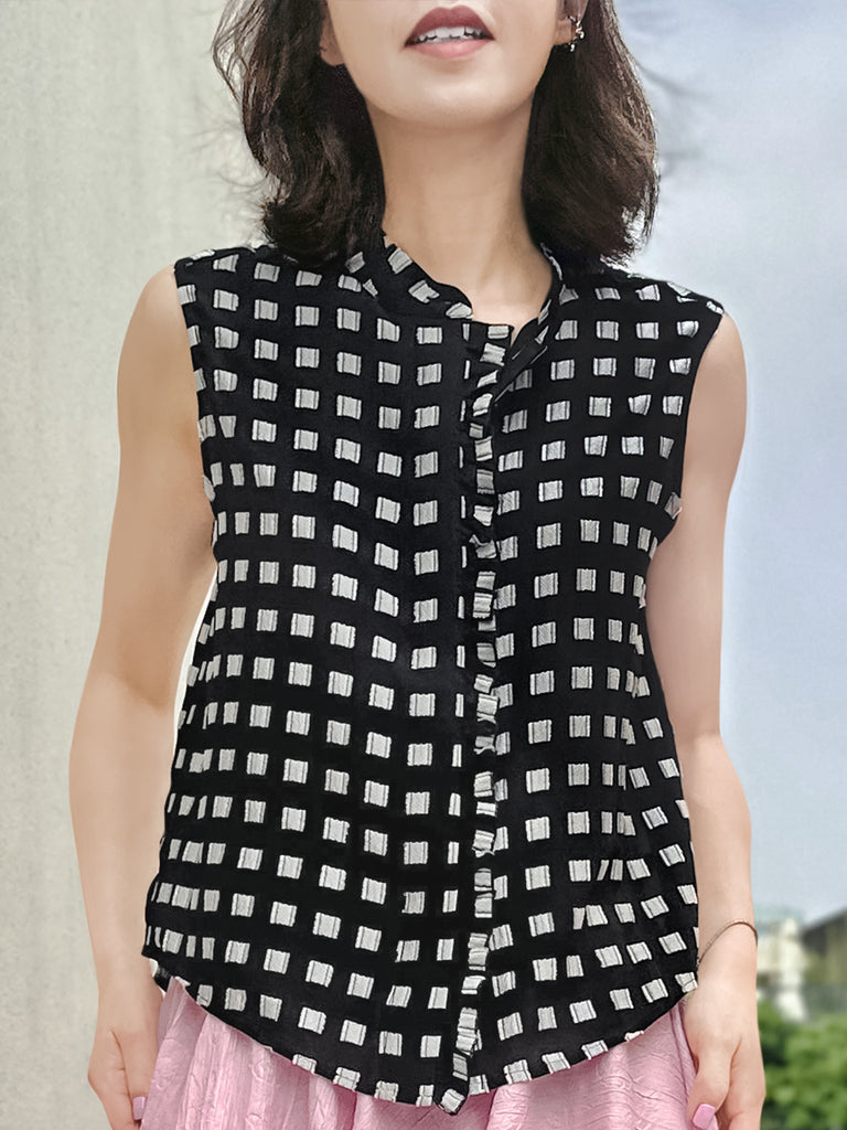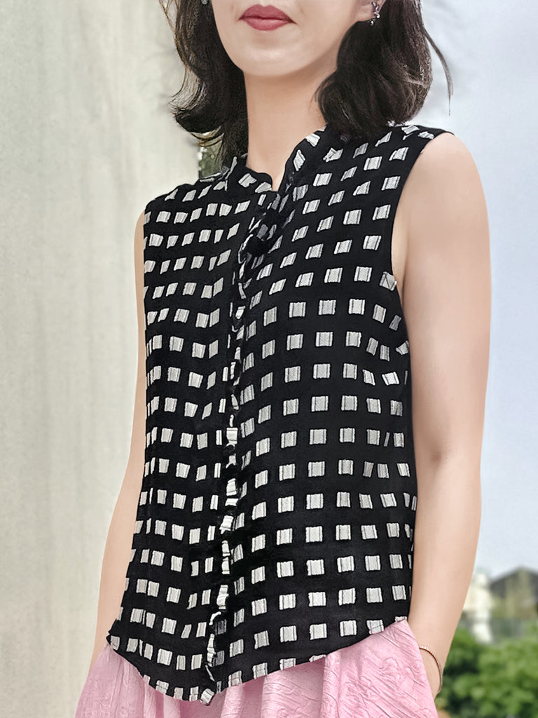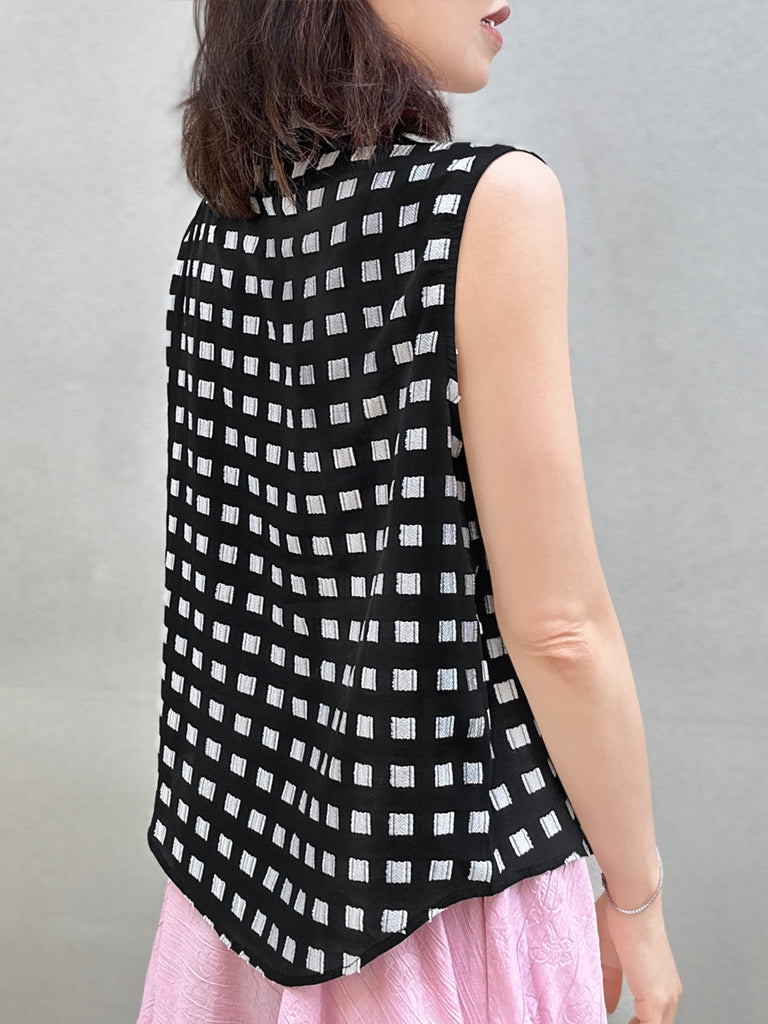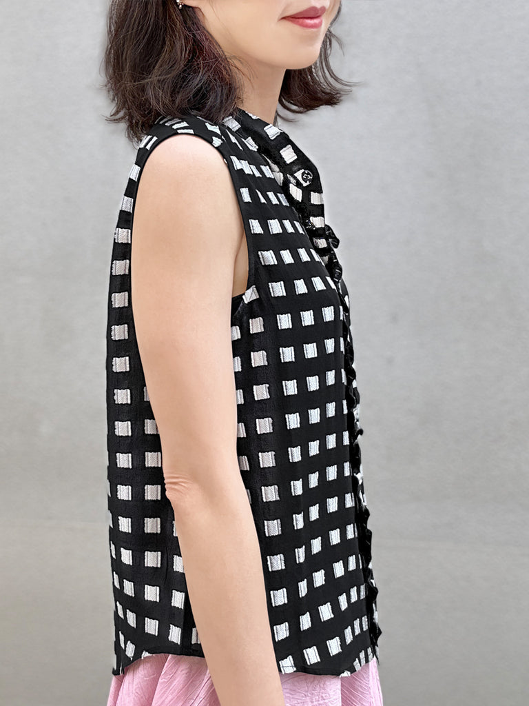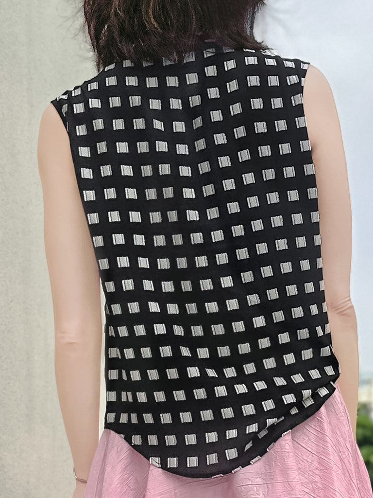 Black Print Tonal Scallop-Stitched Detail Silk Blouse