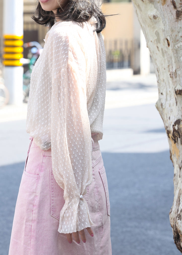 Embossed White Ruffle Collar Long Sleeve Button Silky Blouse