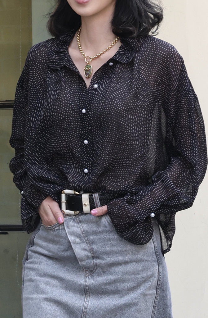 Classic Black Ruffle Collar Long Sleeve Button Silky Blouse