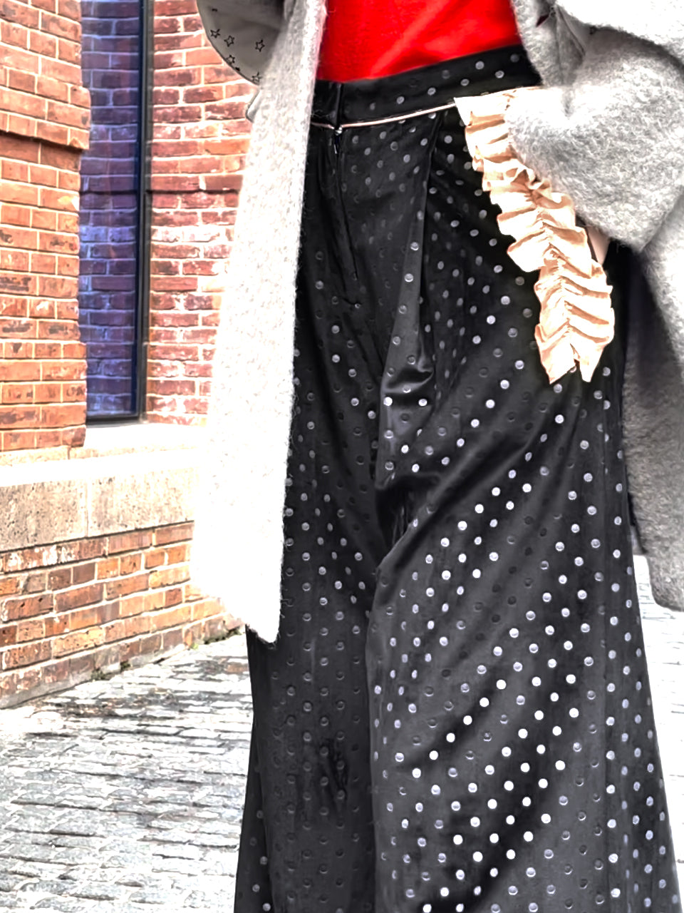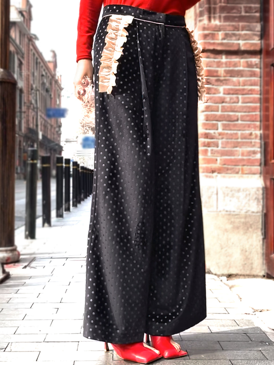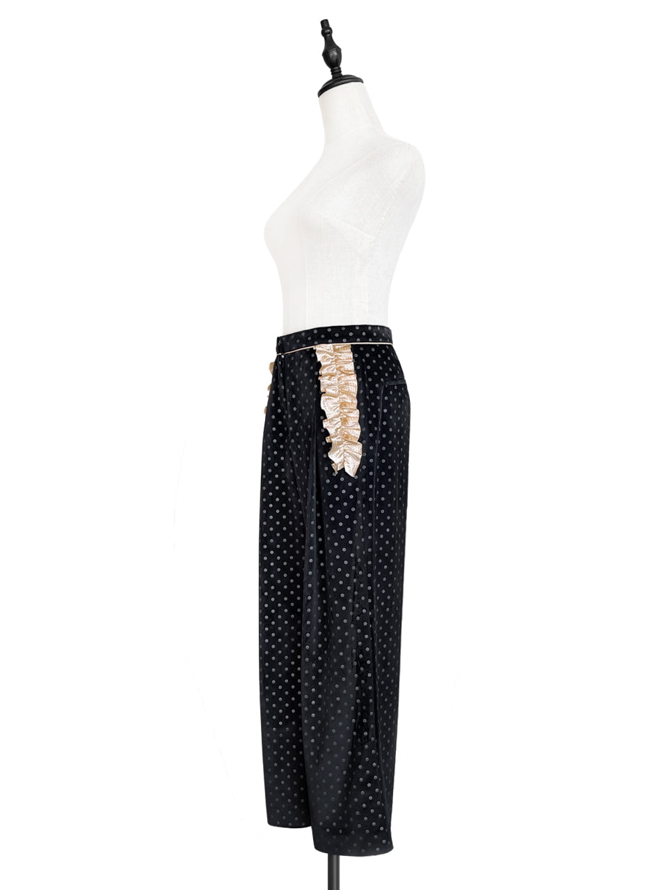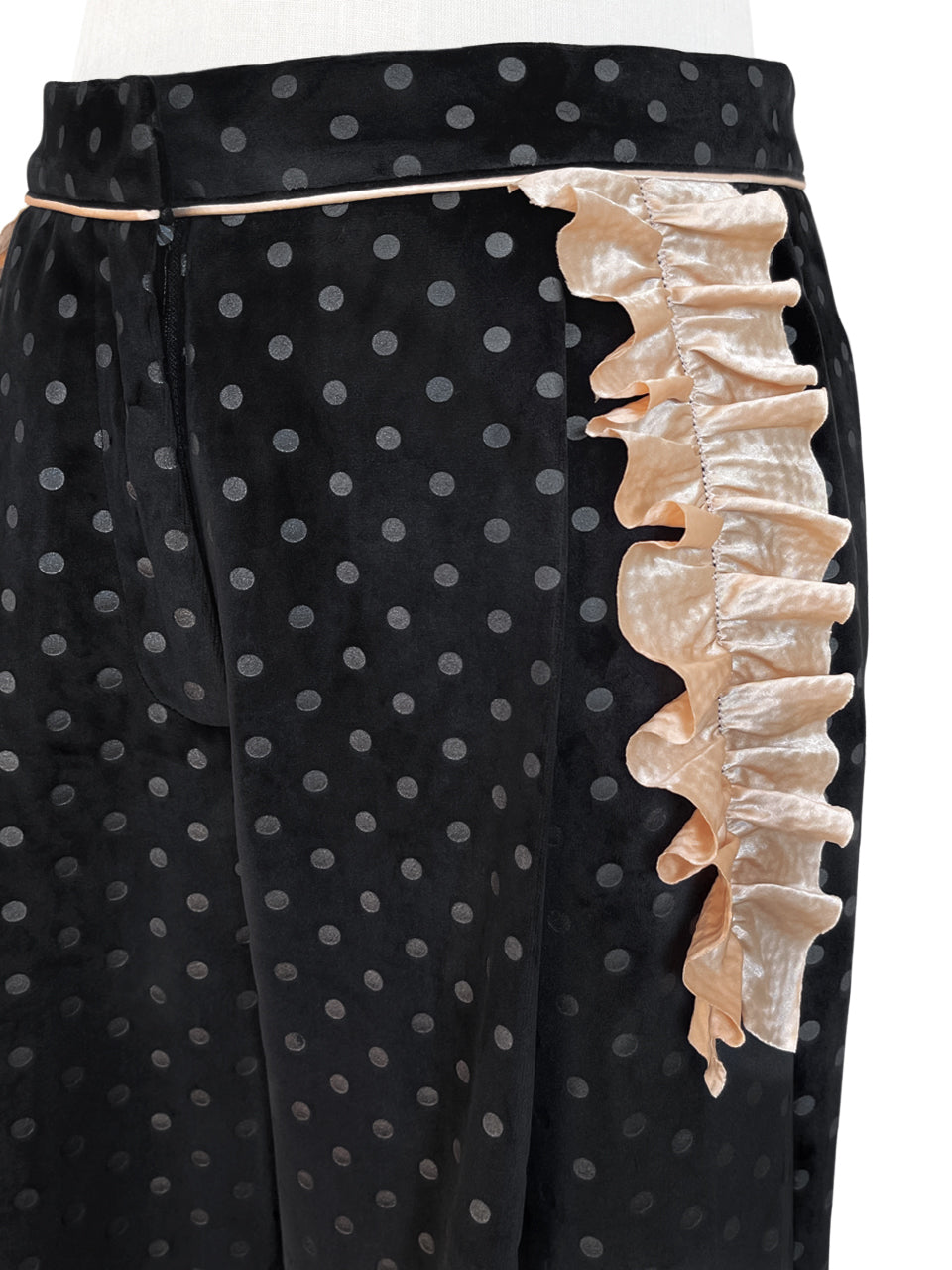 驚喜促銷!黑色圓點荷葉邊口袋寬腿天鵝絨長褲