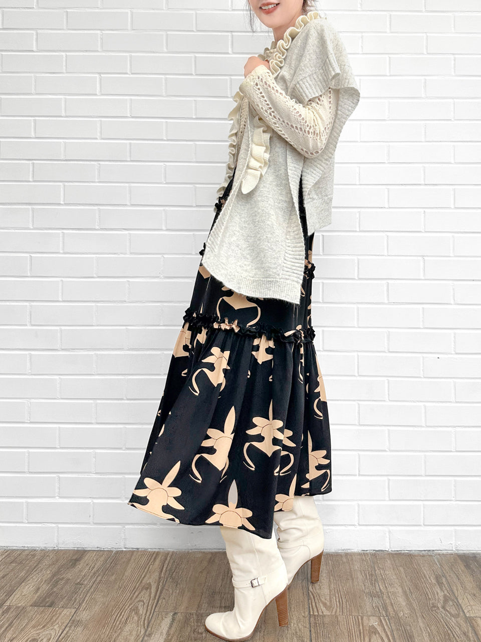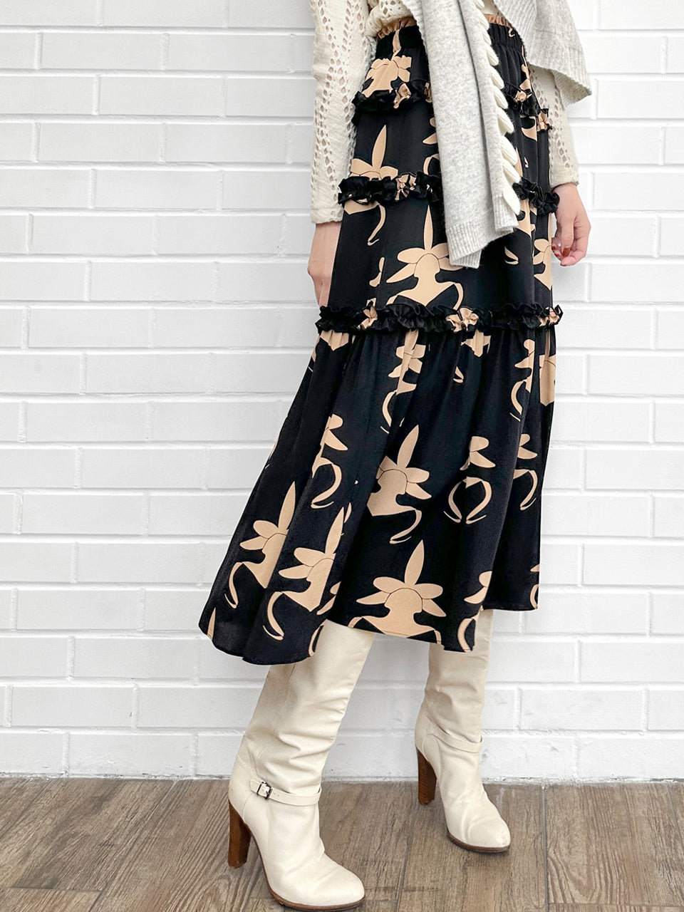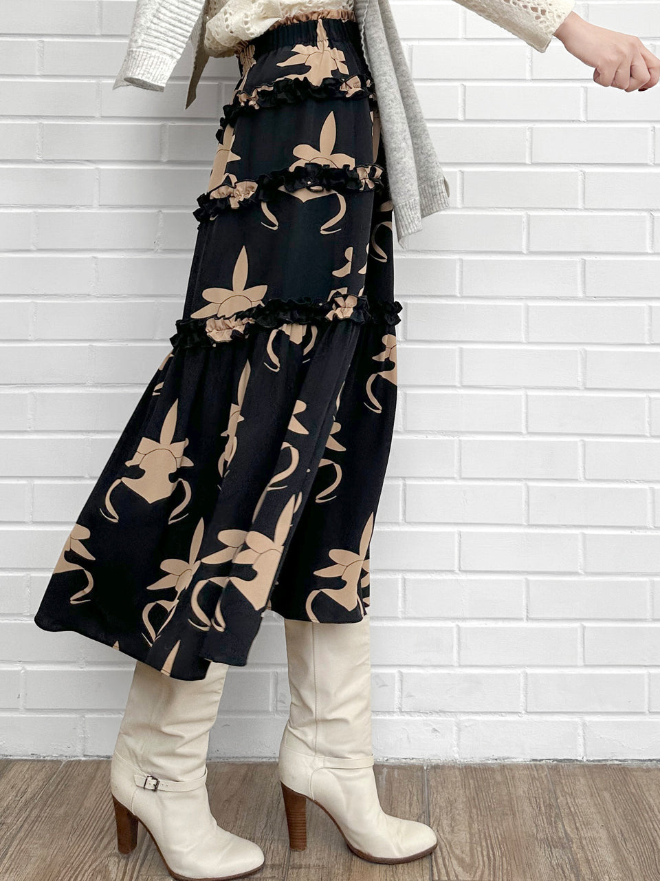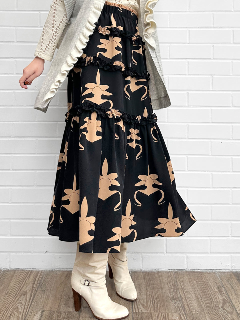蘭花印花荷葉邊分層雪紡絲質長裙
