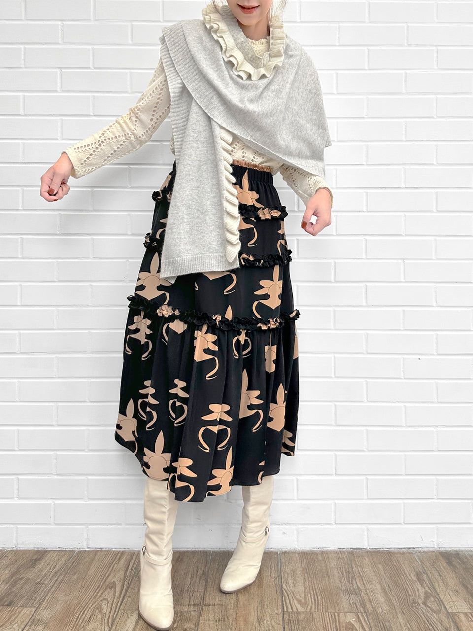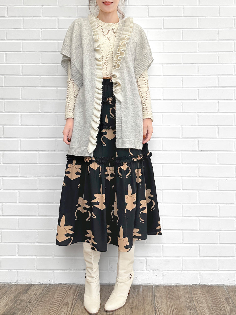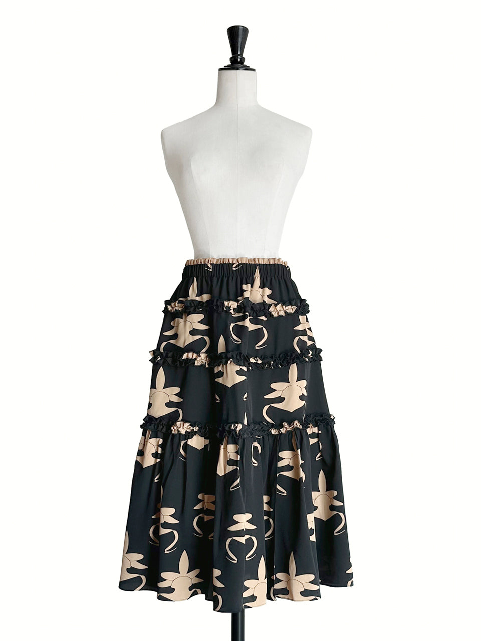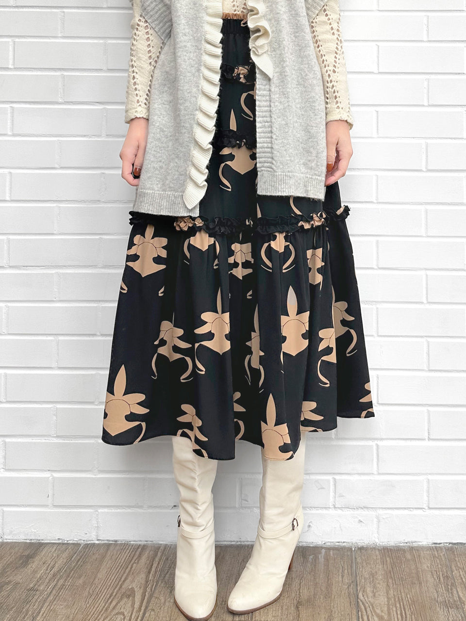 蘭花印花荷葉邊分層雪紡絲質長裙