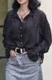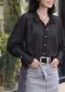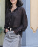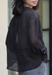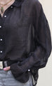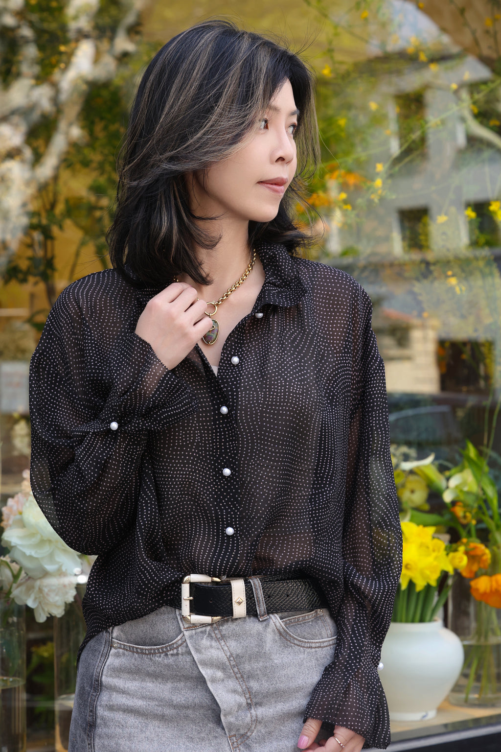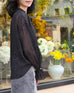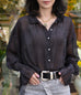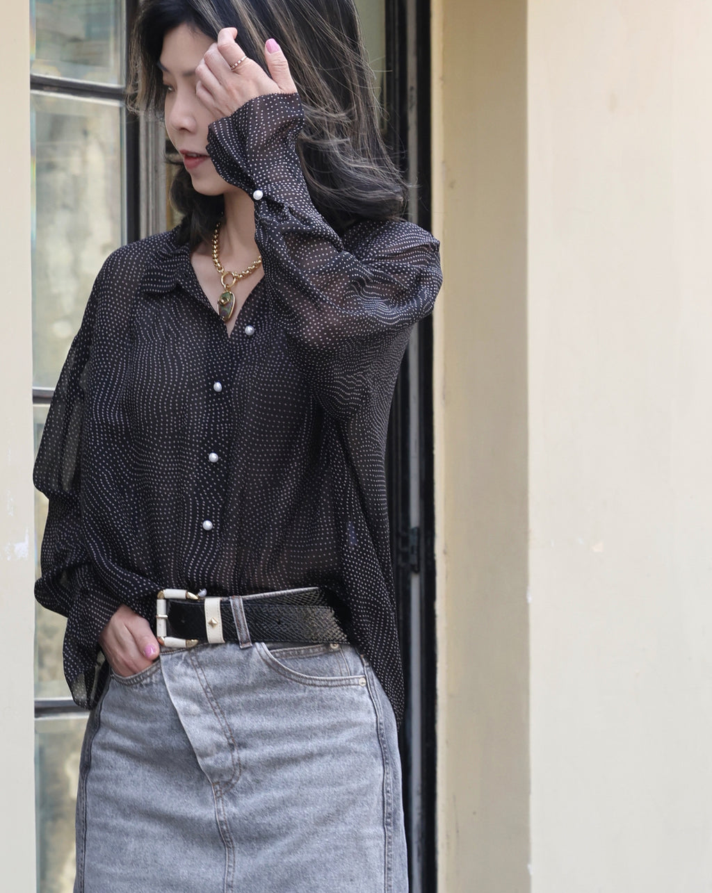 Soft, drapey silk with a breezy flow, this blouse features a pleated collar and flared cuffs with pearl buttons for a touch of polish. The balloon sleeves add volume and elegance, while the relaxed fit brings effortless charm. A perfect blend of comfort and sophistication—ideal for both office hours and casual days out.