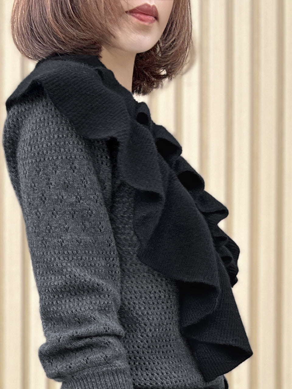 Wrap yourself in warmth and style - This elegant scarf drapes perfectly around your neck, adding a cozy layer to any kinds of cardigan, coat, or blouse. Crafted from luxurious cashmere with one wide and one narrow ruffle, it offers versatile styling options to wrapping around the neck. Available in beige, jade, black, and soft brick for an effortlessly chic look.