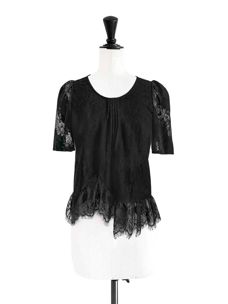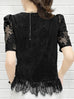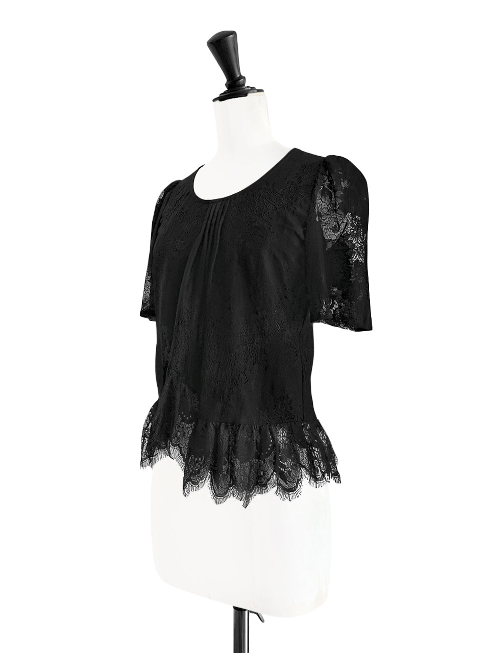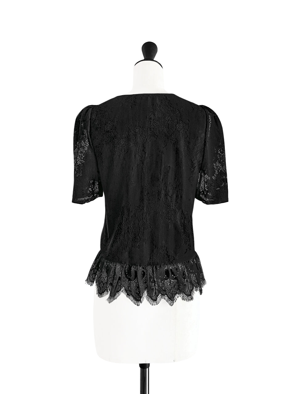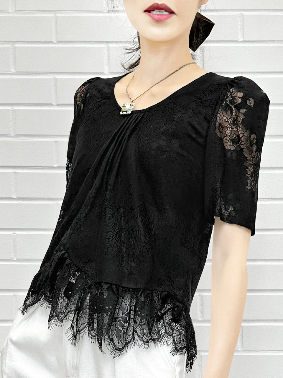 優雅黑色花卉蕾絲褶襉荷葉邊襯衫