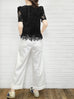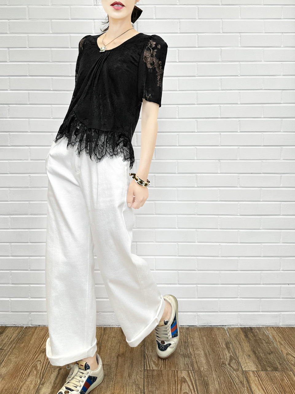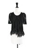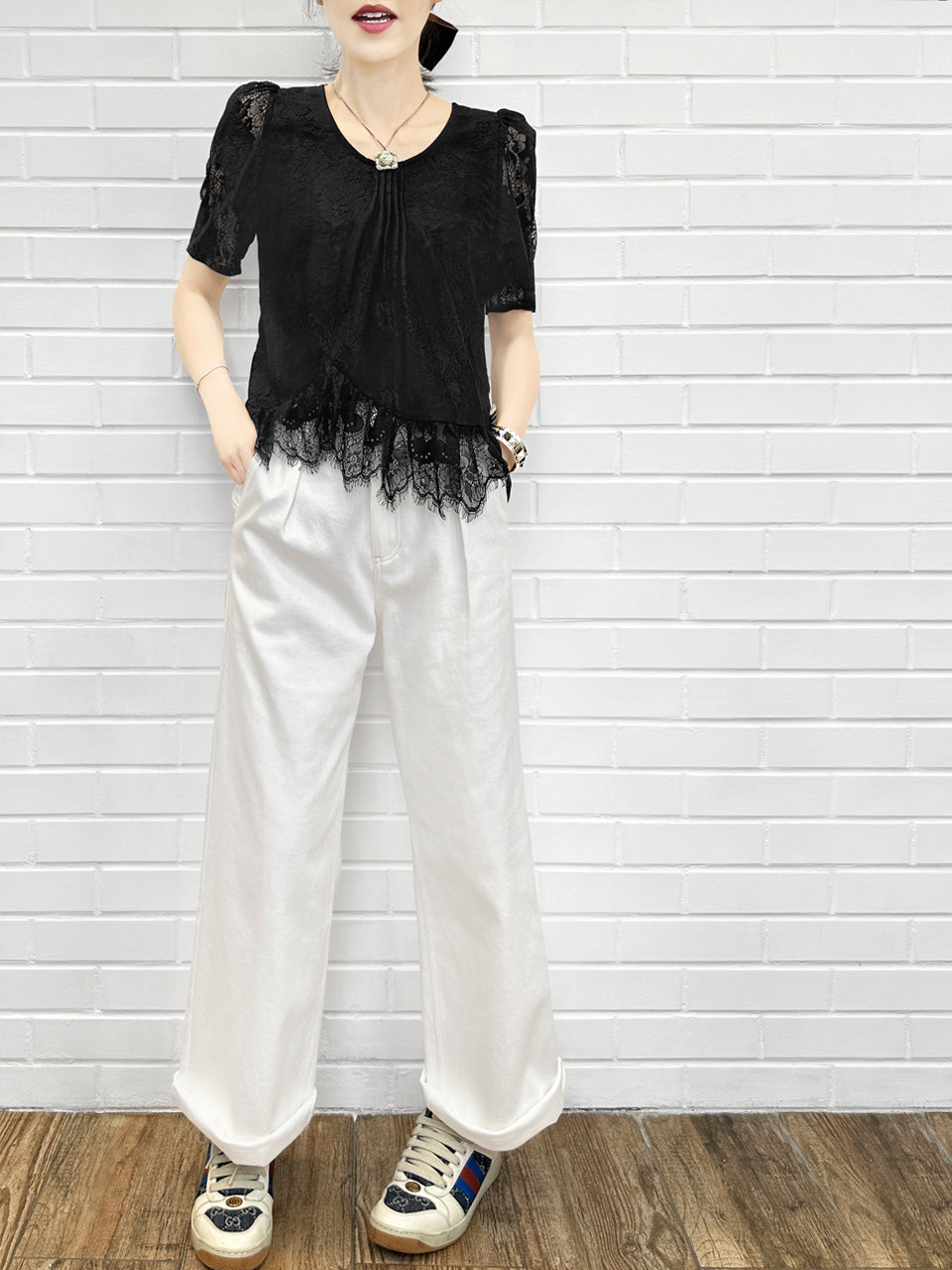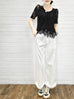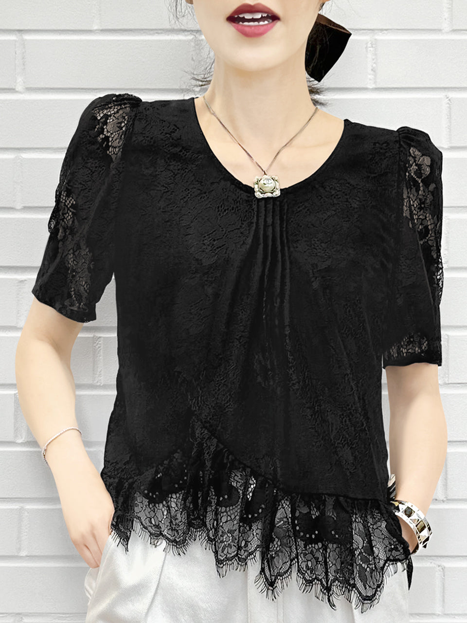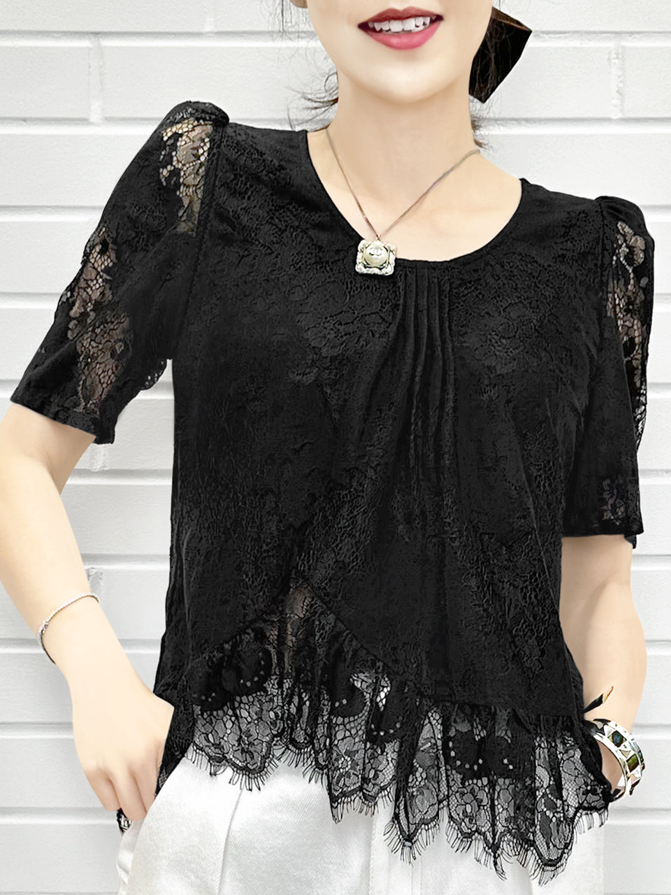 優雅黑色花卉蕾絲褶襉荷葉邊襯衫