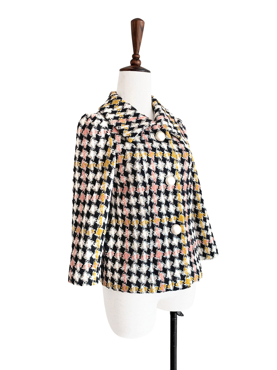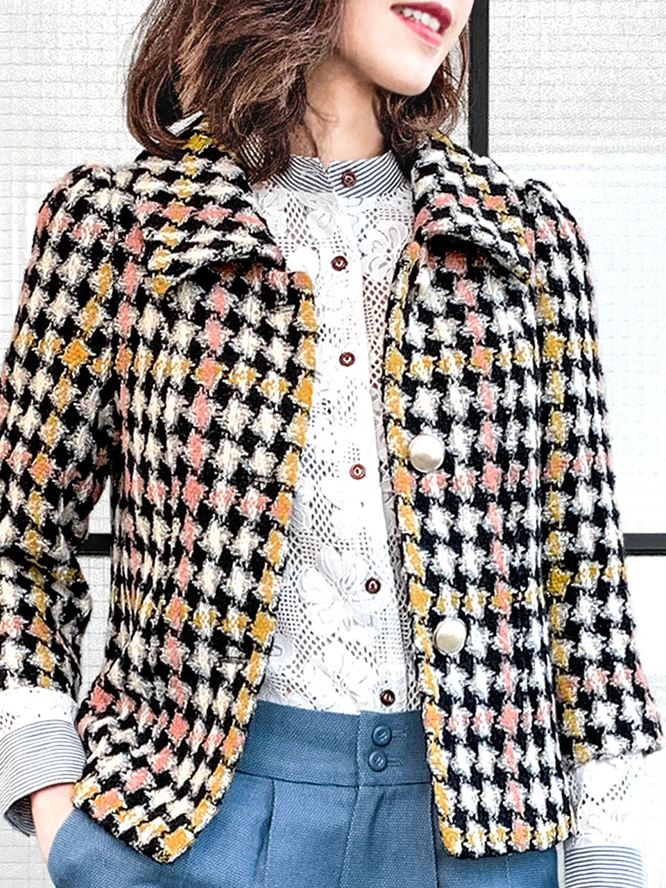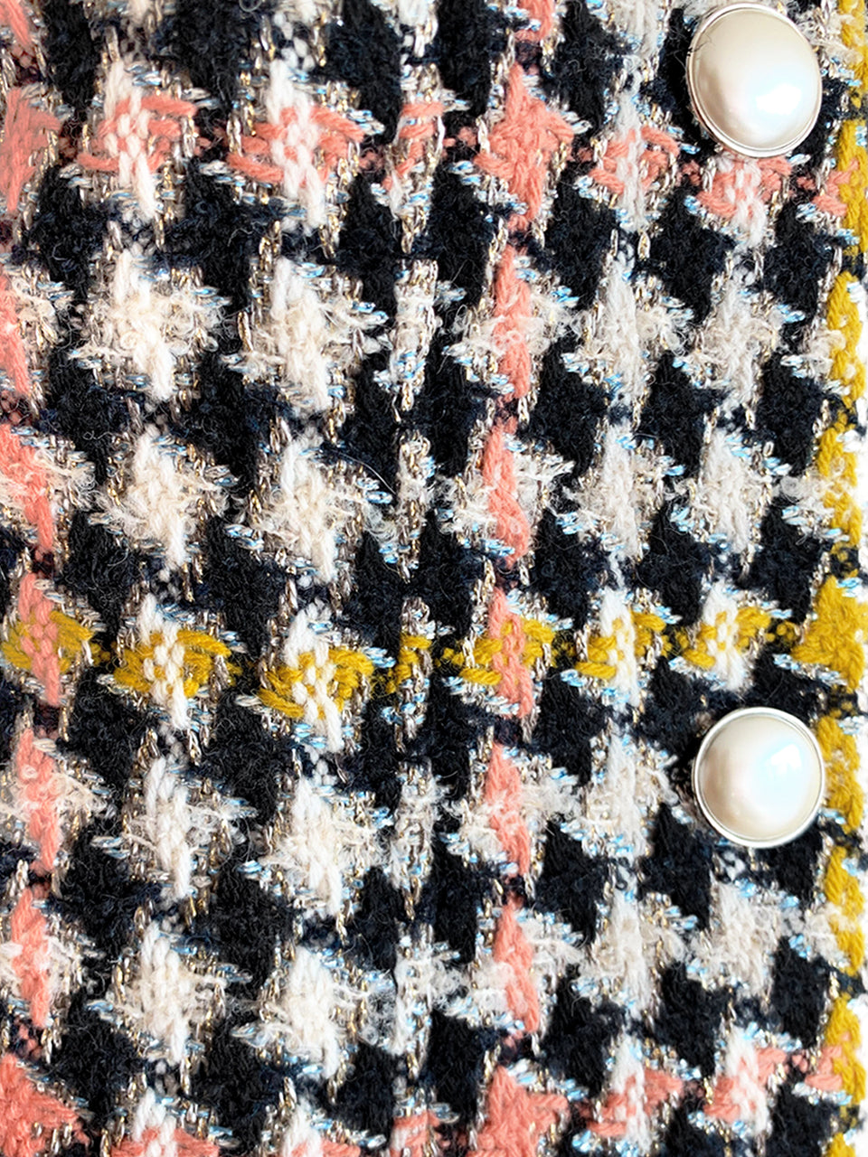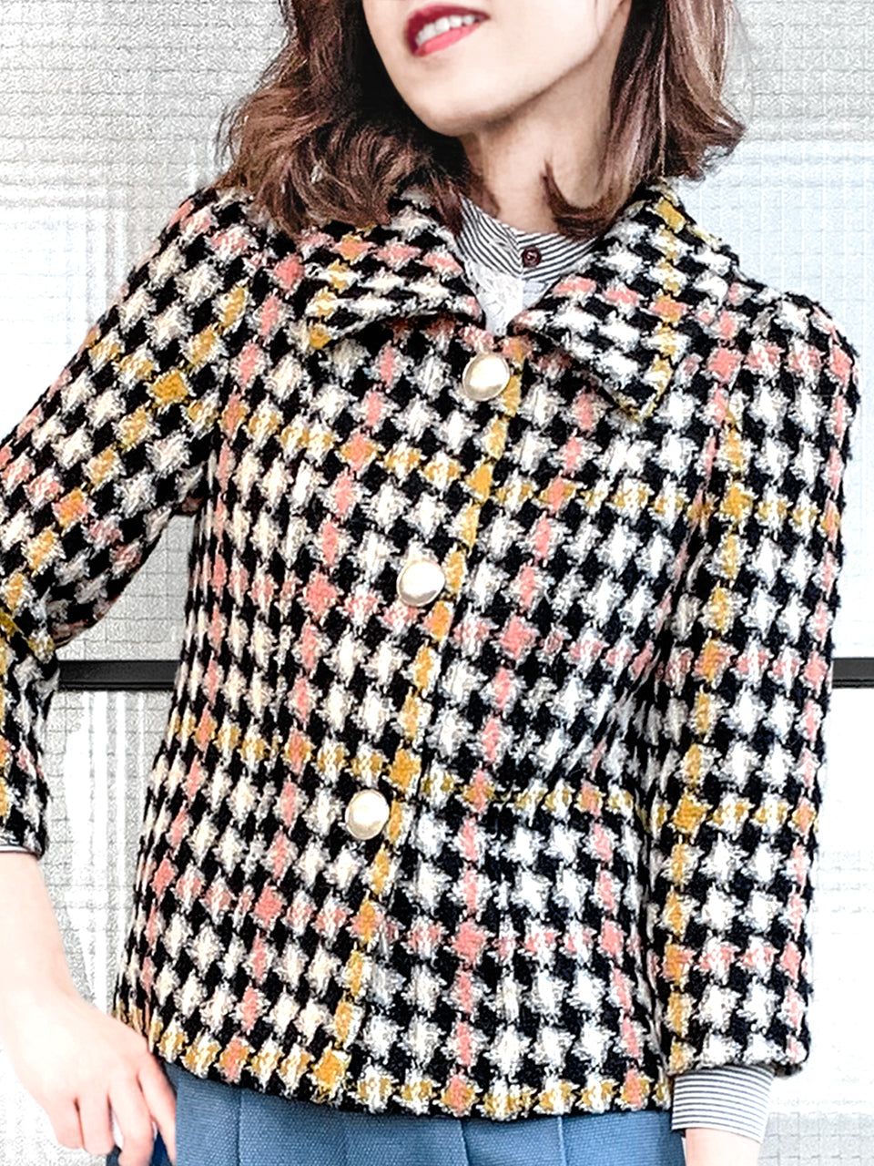 這款色彩繽紛的千鳥格夾克採用拋光珍珠圓頂紐扣設計,既復古又軍裝