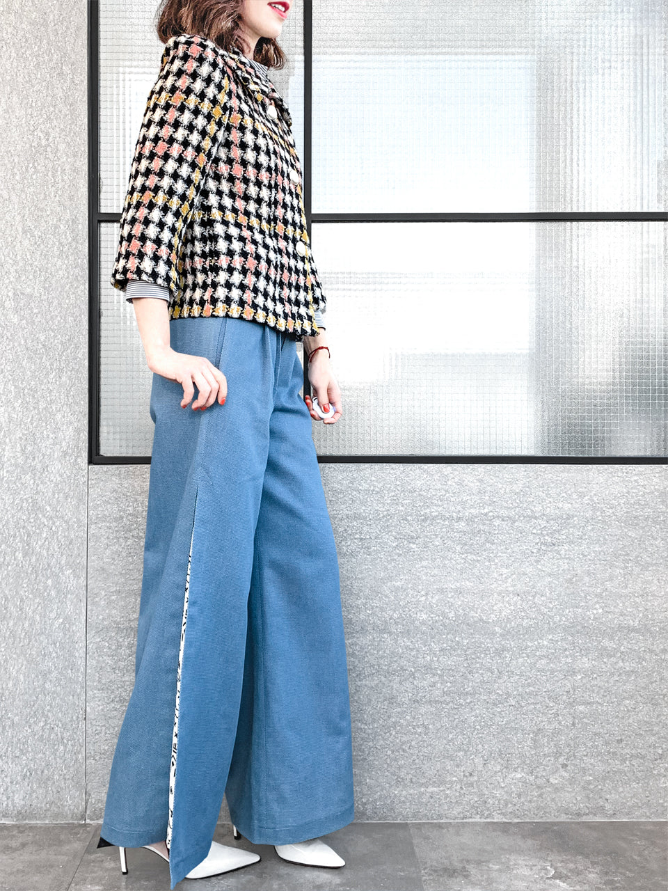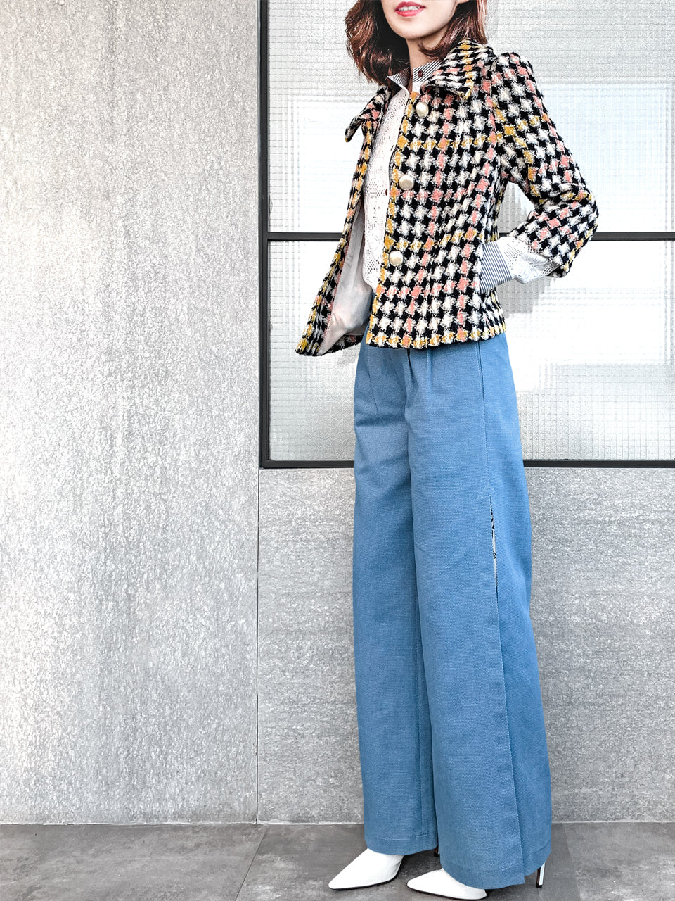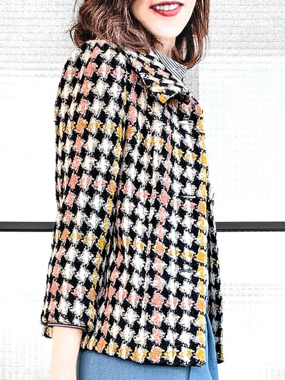 這款剪裁巧妙的夾克採用方領廓形,三顆珍珠大紐扣和彩色千鳥格花呢致敬本季航海靈感