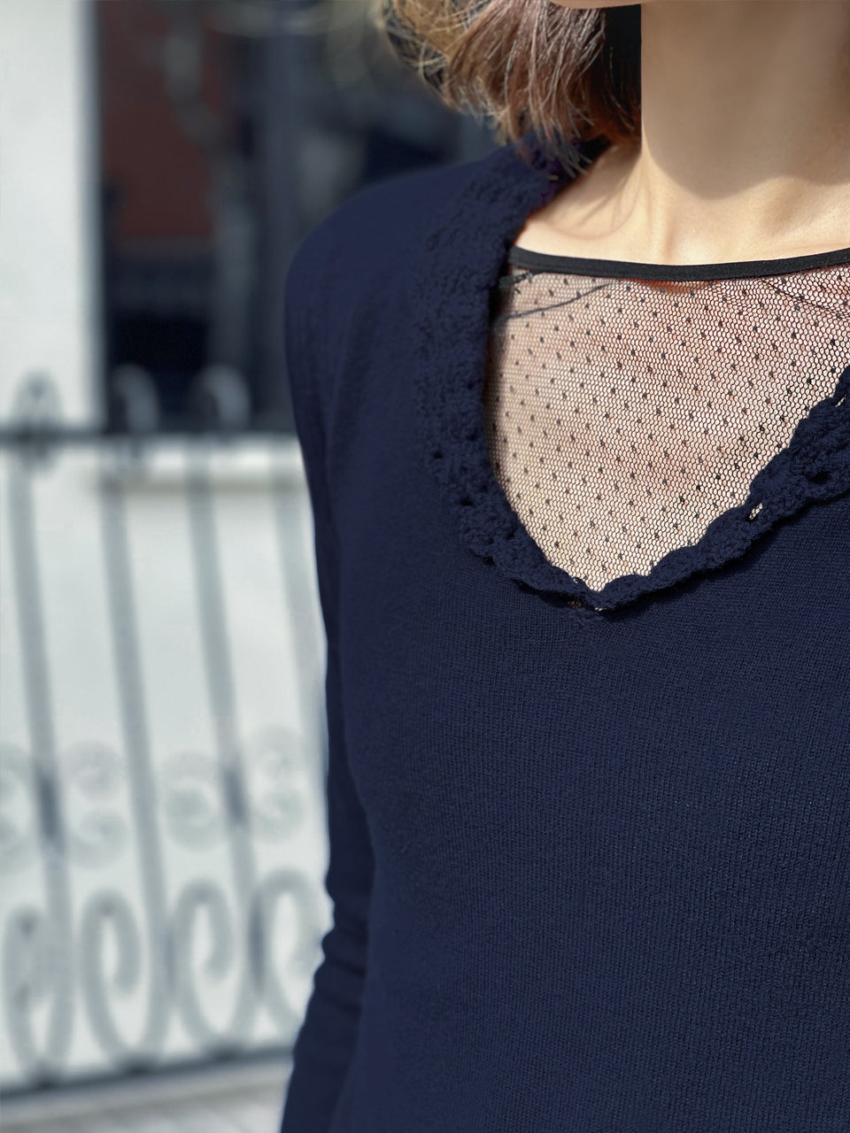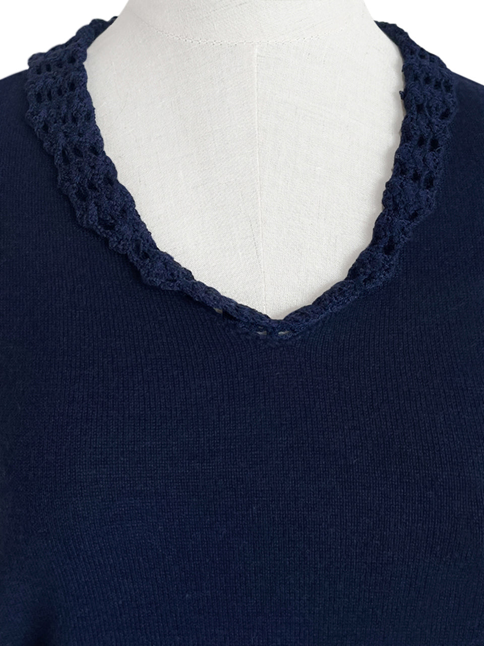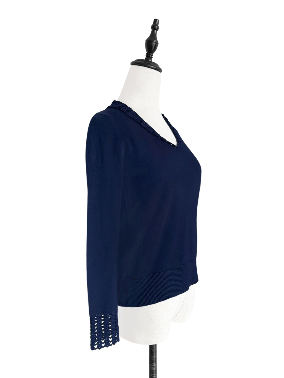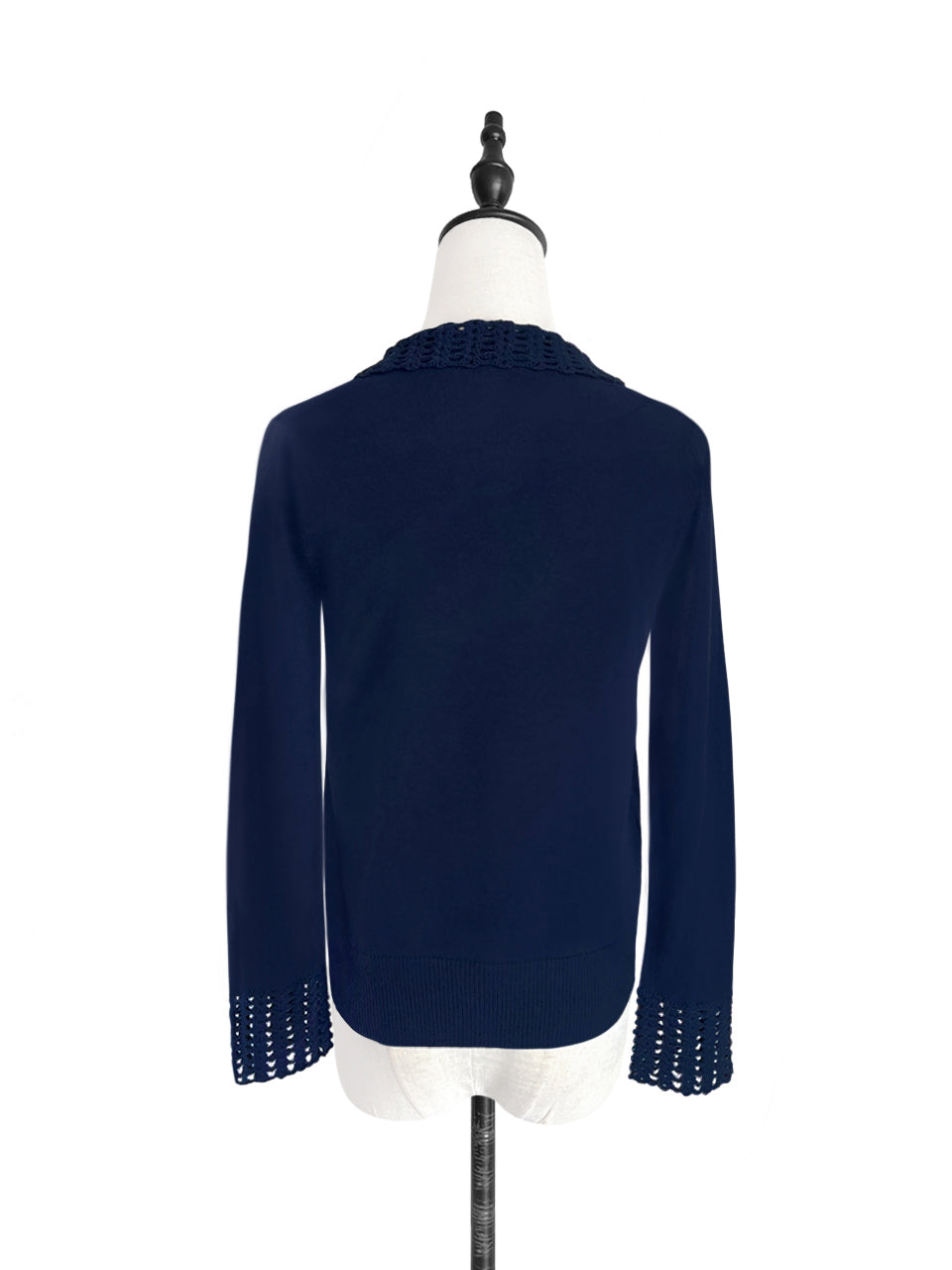 這是 TYNVIE 系列的新款式,是一款經典的百搭針織品。 80% 羊毛、20% 羊絨,袖口和衣領採用手工鉤編。海軍藍總是具有多種用途,因此我們沒有嘗試其他顏色。它用途廣泛,可伴您度過冬季及以後。
