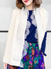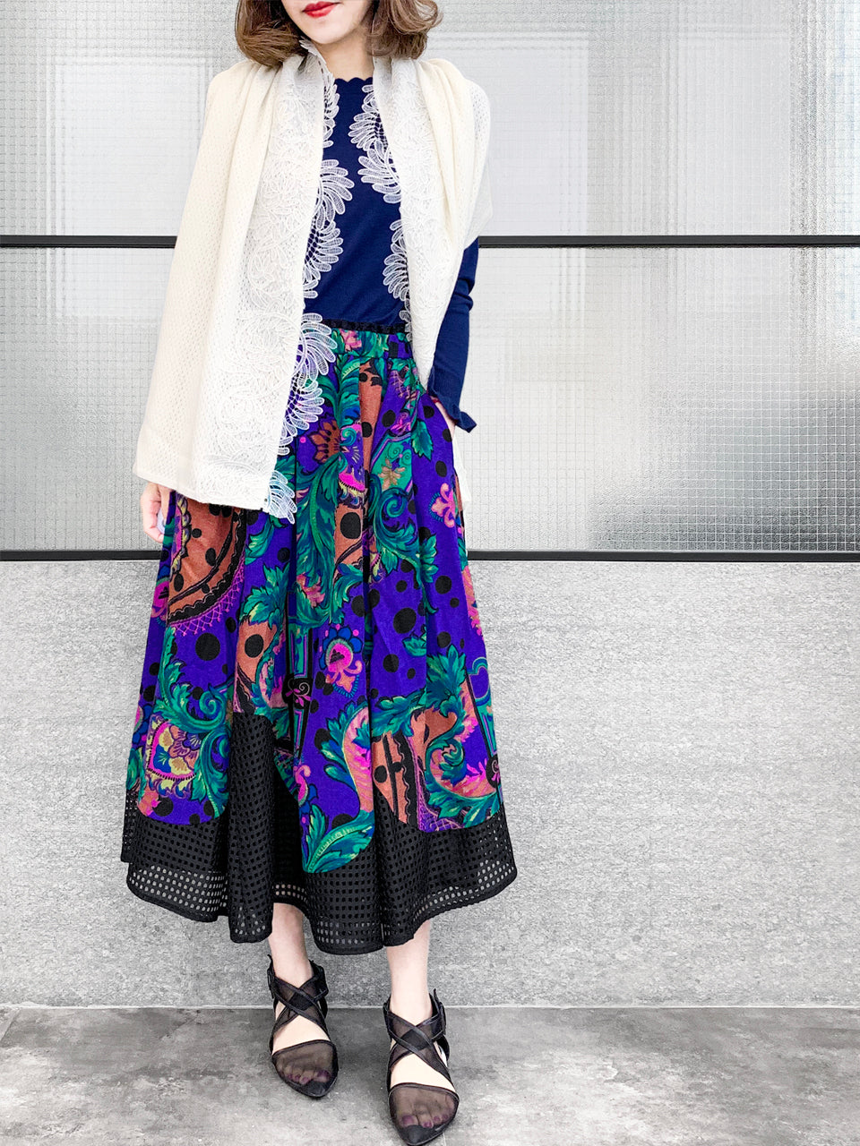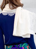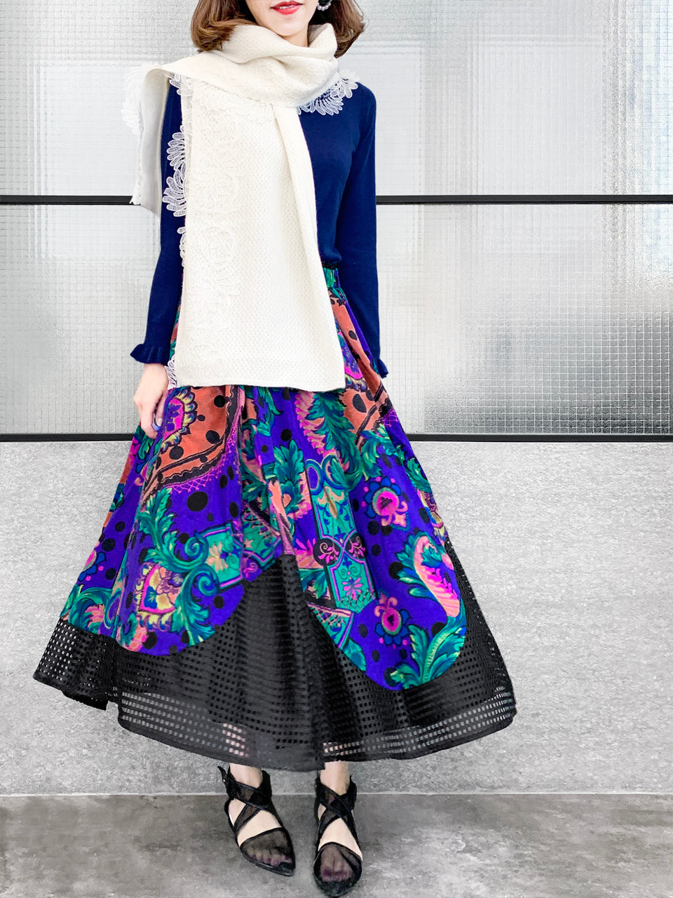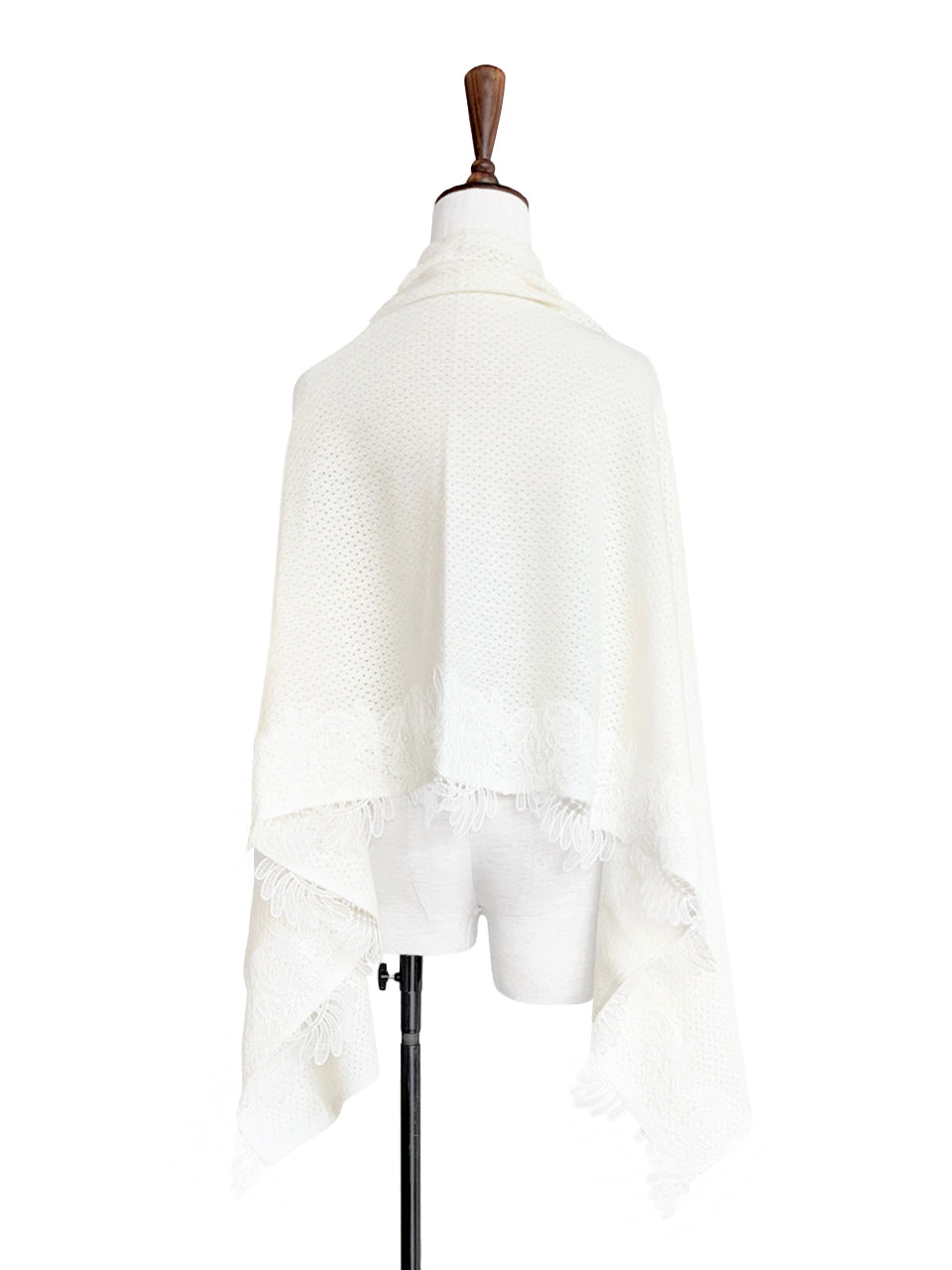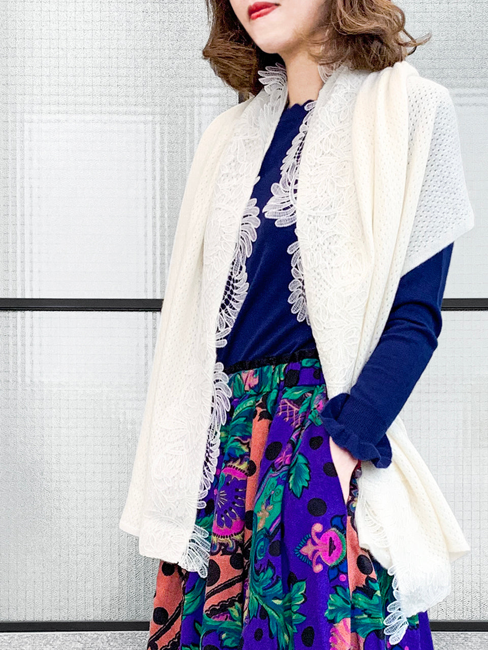 華麗縫製羊絨風格柔軟舒適的針織圍巾,邊緣飾有漂亮的刺繡花卉蕾絲,可內穿或外穿