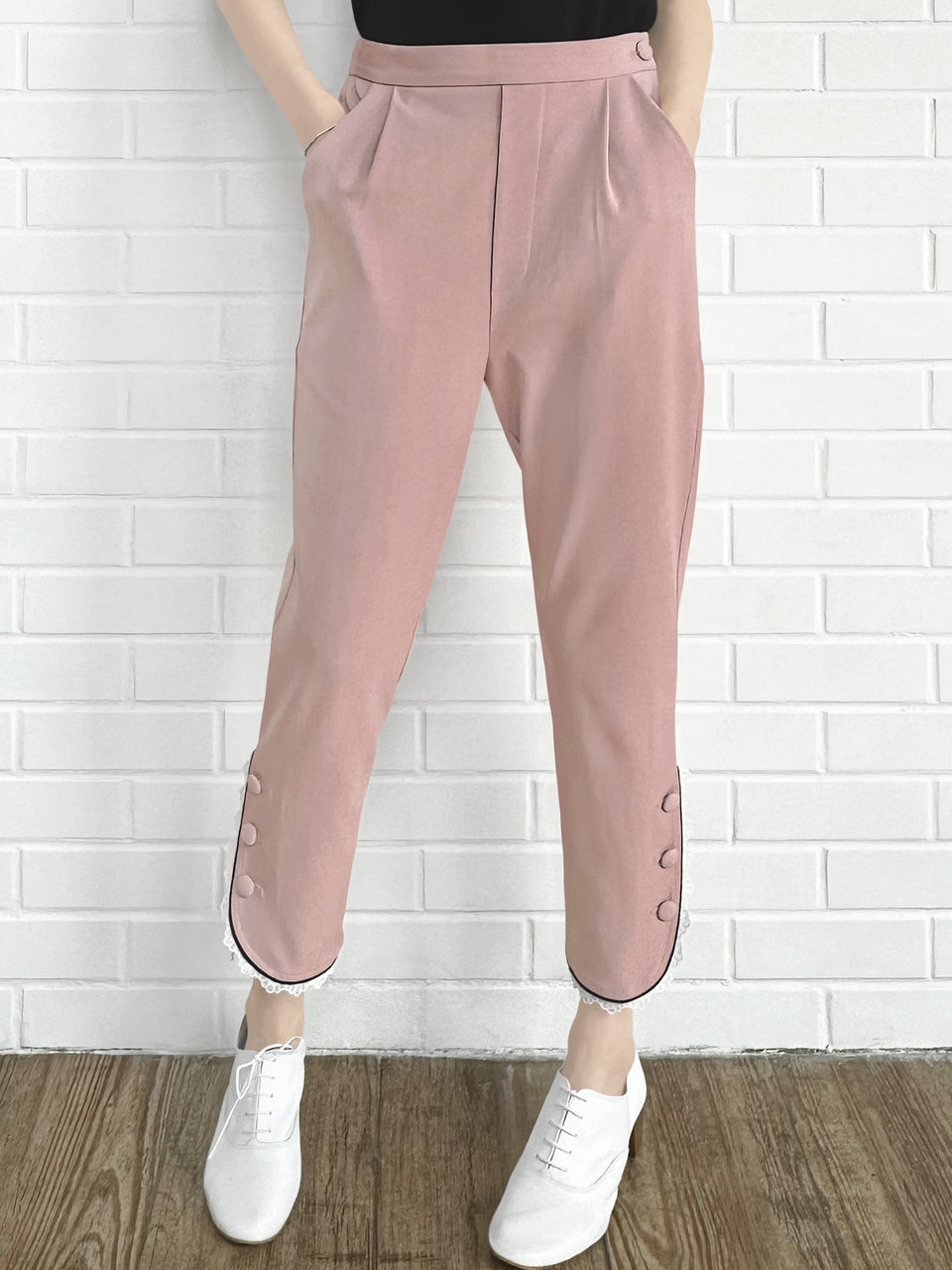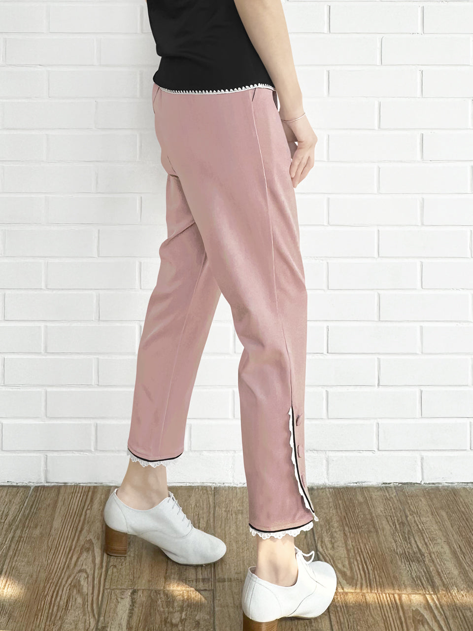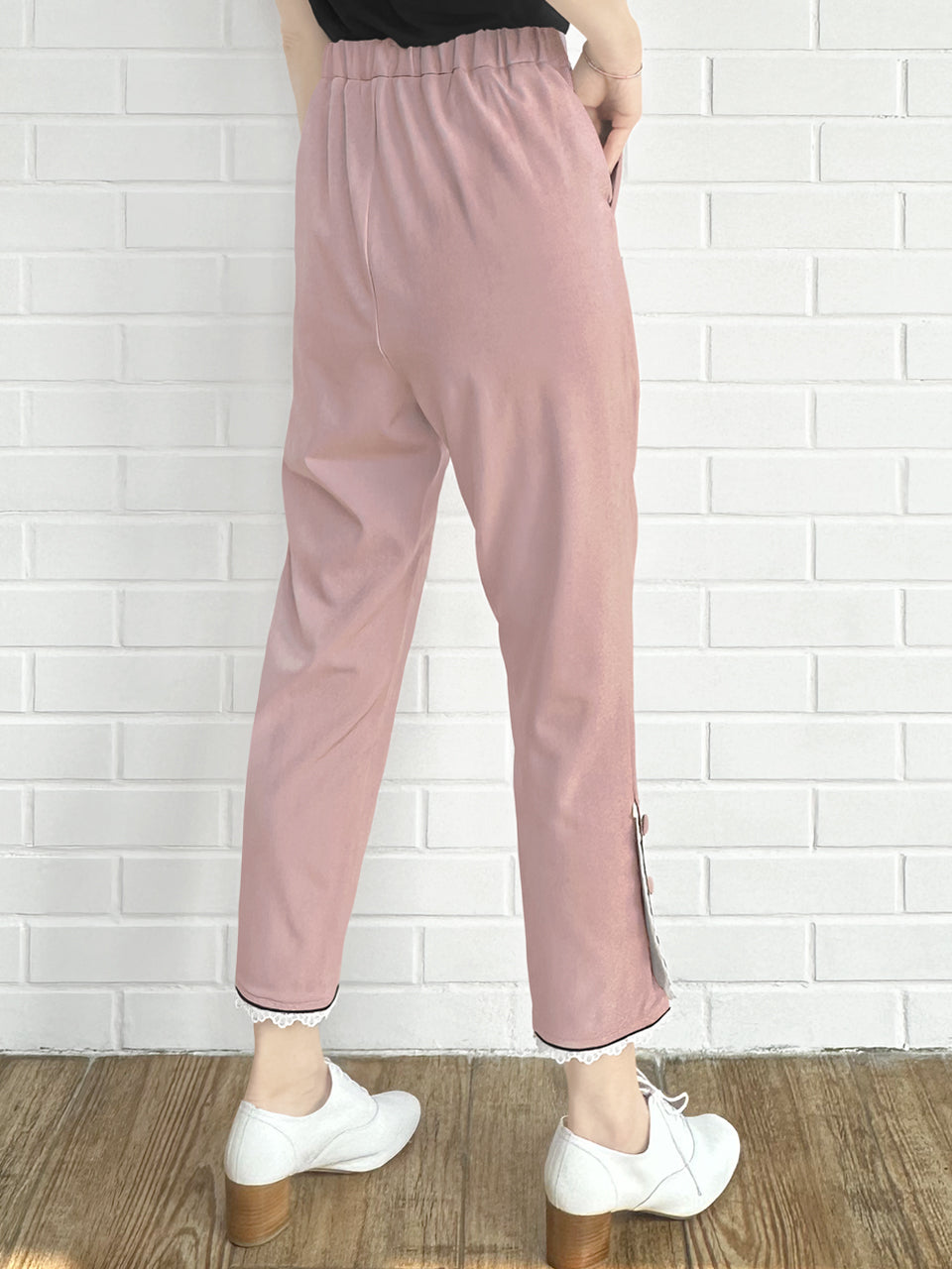 粉紅色撞色滾邊蕾絲細部錐形九分褲