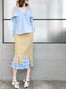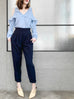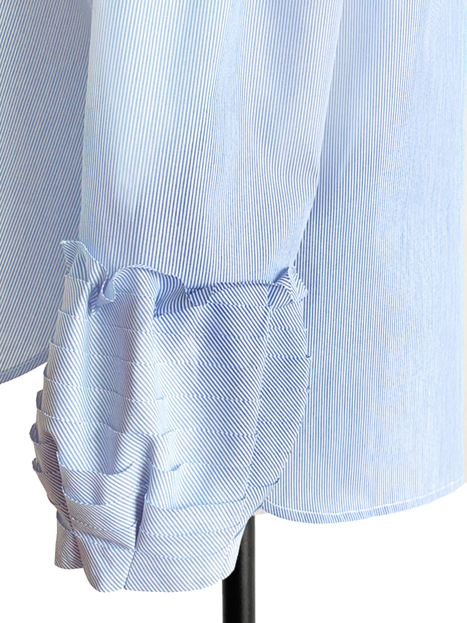 這款荷葉邊裝飾辦公室上衣採用酷炫細條紋混合設計,採用修身露肩 V 領和燈籠袖,搭配毛邊分層燈籠袖口