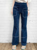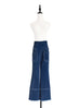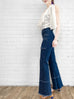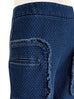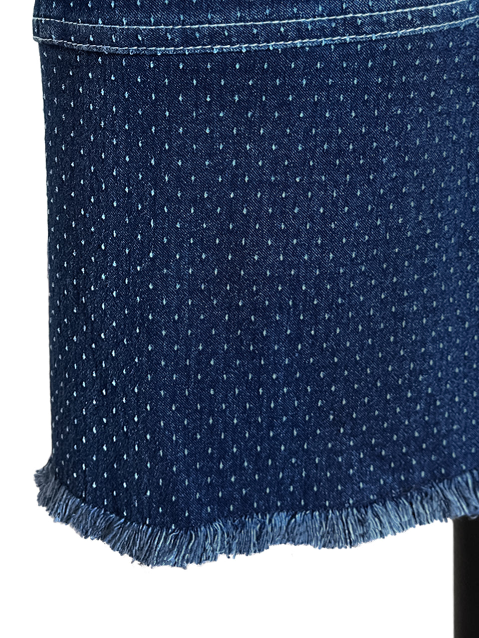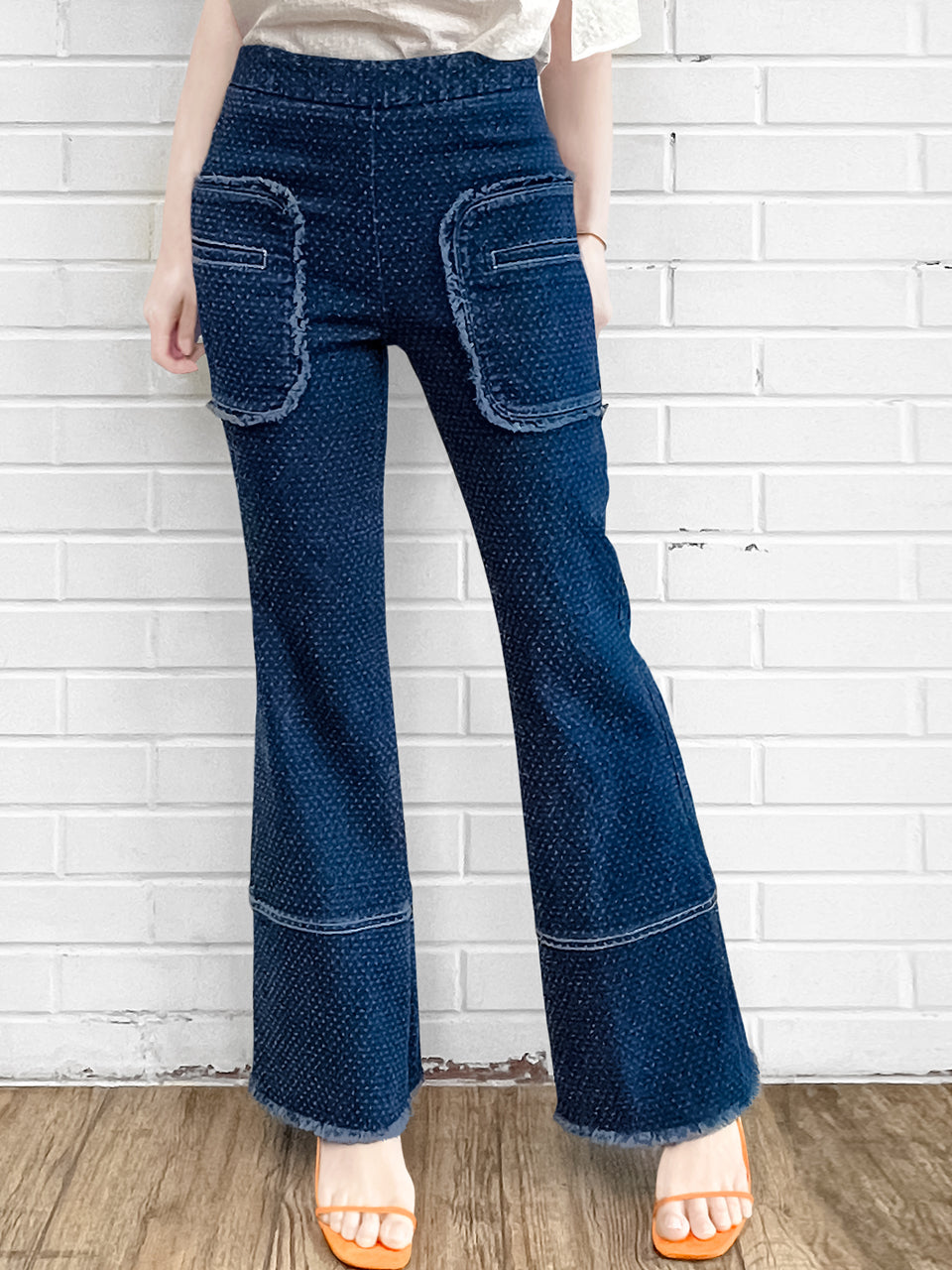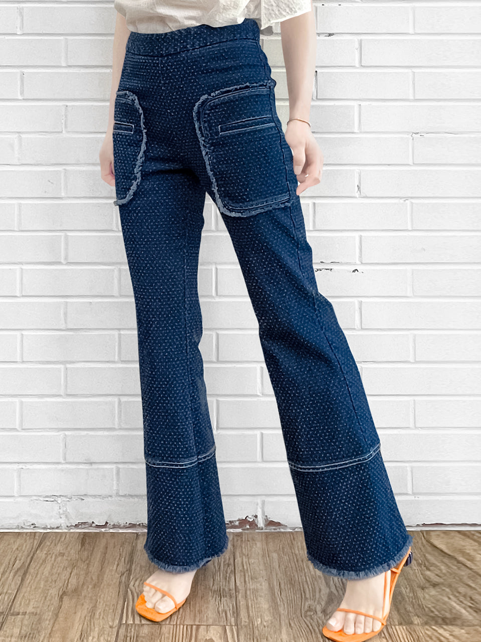 高腰深色水洗牛仔褲,採用彈性圓點牛仔布製成,配有毛邊拼貼前袋,絕對出乎您的意料