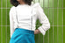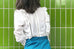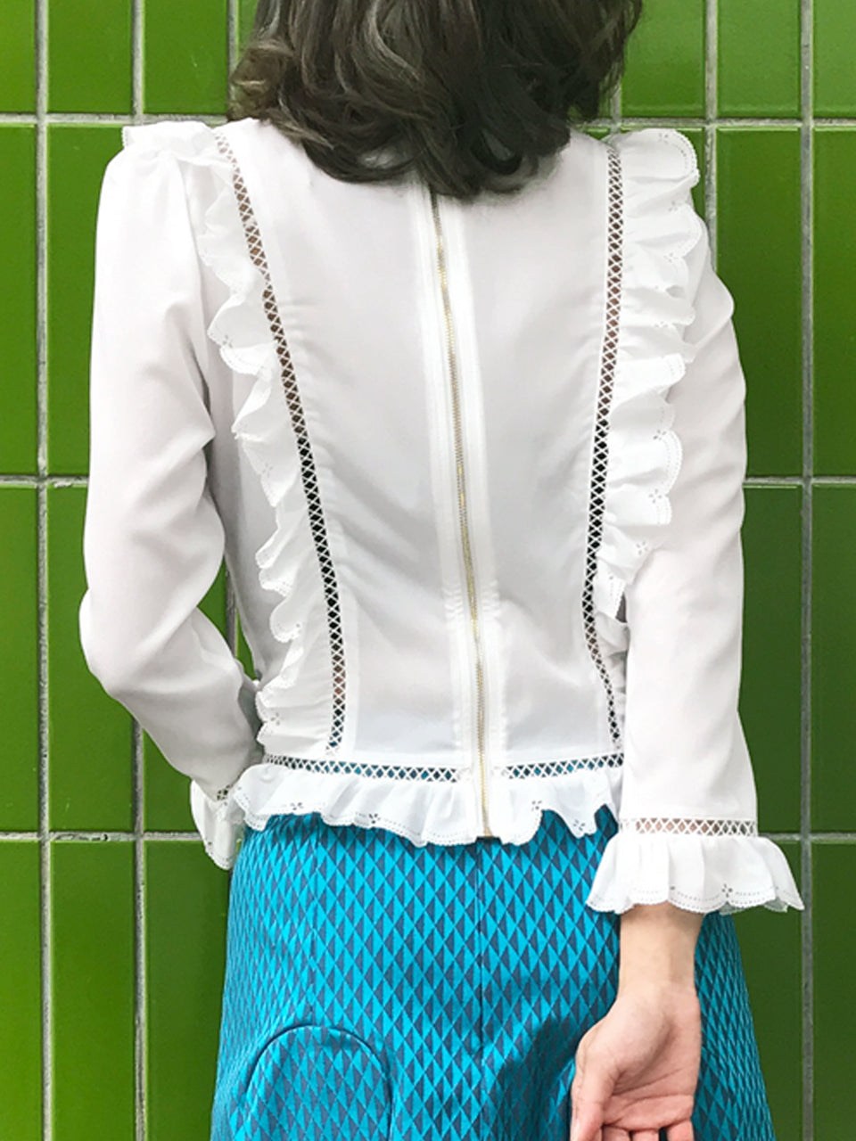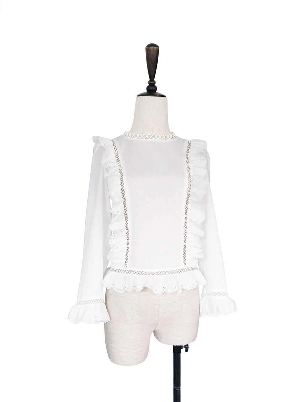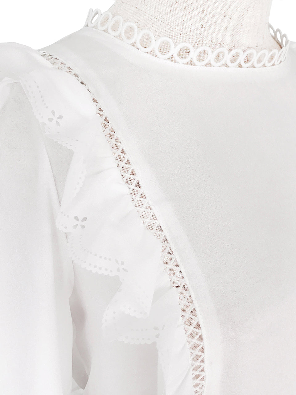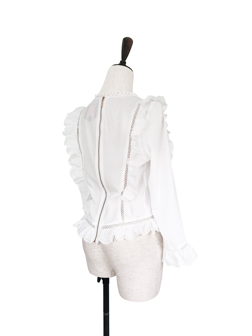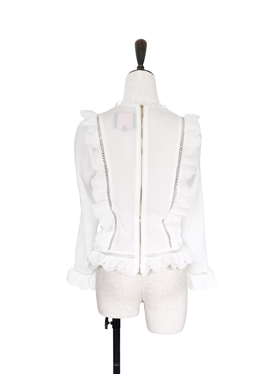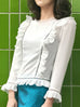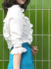 這款時尚襯衫採用略顯正式的美感,飾有精美的開放式工藝和圓形蕾絲高領。鏤空印花邊緣為其牛津藍色柔軟質地面料的精緻褶皺帶來令人愉悅的觸感。其修長的輪廓巧妙地鑲有扇形荷葉邊,巧妙地放置以修飾身材。